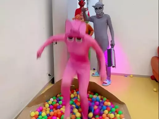 这是一则真人版节奏盒子的生活记录帖,画面里一群穿着色彩各异的节奏盒子角色服装的人,依次做出倒地等趣味动作,还原节奏盒子的相关玩法,充满趣味性。