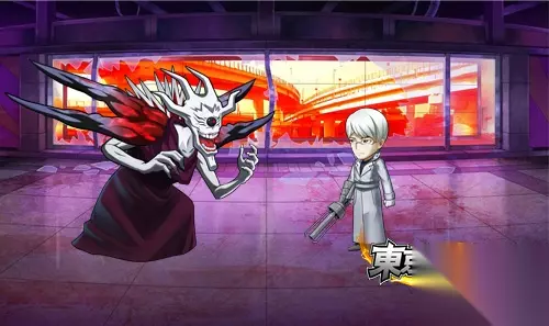图02 东京食尸鬼手游 有马贵将VS枭 攒够怒气开启觉醒变身的有马贵将,在变身之后一头白发,身着白色风衣,外表冷酷,可使用多种武器攻击敌人,威力强大,所向披靡。