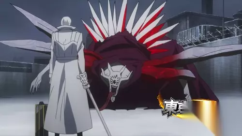 图01 动漫原作 有马贵将VS枭 战斗变身前的有马贵将是一个年轻的黑发少年,身穿CCG普通士兵制服,手拿太刀对单个敌人进行狂斩。