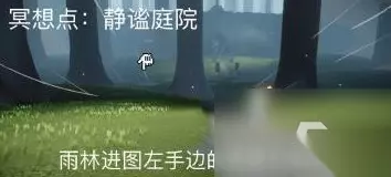 《光遇》静谧庭院位置介绍 光遇静谧庭院位置在雨林地图章左手边石碑哪里。 1、雨林地图进去后往左,有一个发光的位置。 2、玩家们在雨林地图中过了云层之后看见门进去,在左前方的位置有一个发光的石碑,周围一圈全是树。 3、玩家在哪里进行冥想,然后在看了cg动画后,便可以完成冥想任务。
