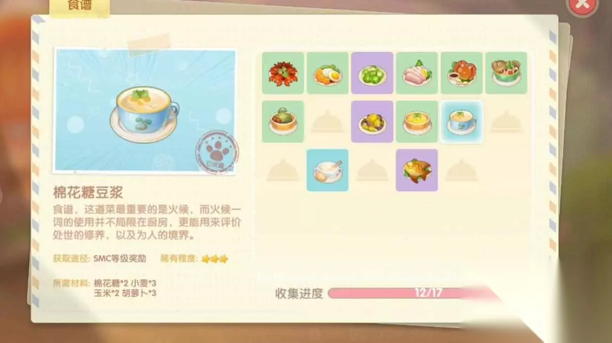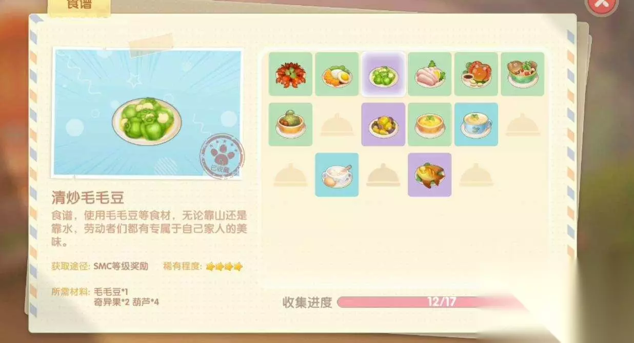 9、小麦牛奶蛋粥 所需材料:小麦2个、牛奶1个、鸡蛋2个、鸭蛋1个 厨师等级:8级 稀有度:★★★ 10、葫芦炒茄子 所需材料:葫芦3个、茄子5个、南瓜2个、白菜2个 厨师等级:10级 稀有度:★★★★ 11、清炒毛毛豆 所需材料:毛毛豆1个、奇异果2个、葫芦4个 厨师等级:12级 稀有度:★★★★