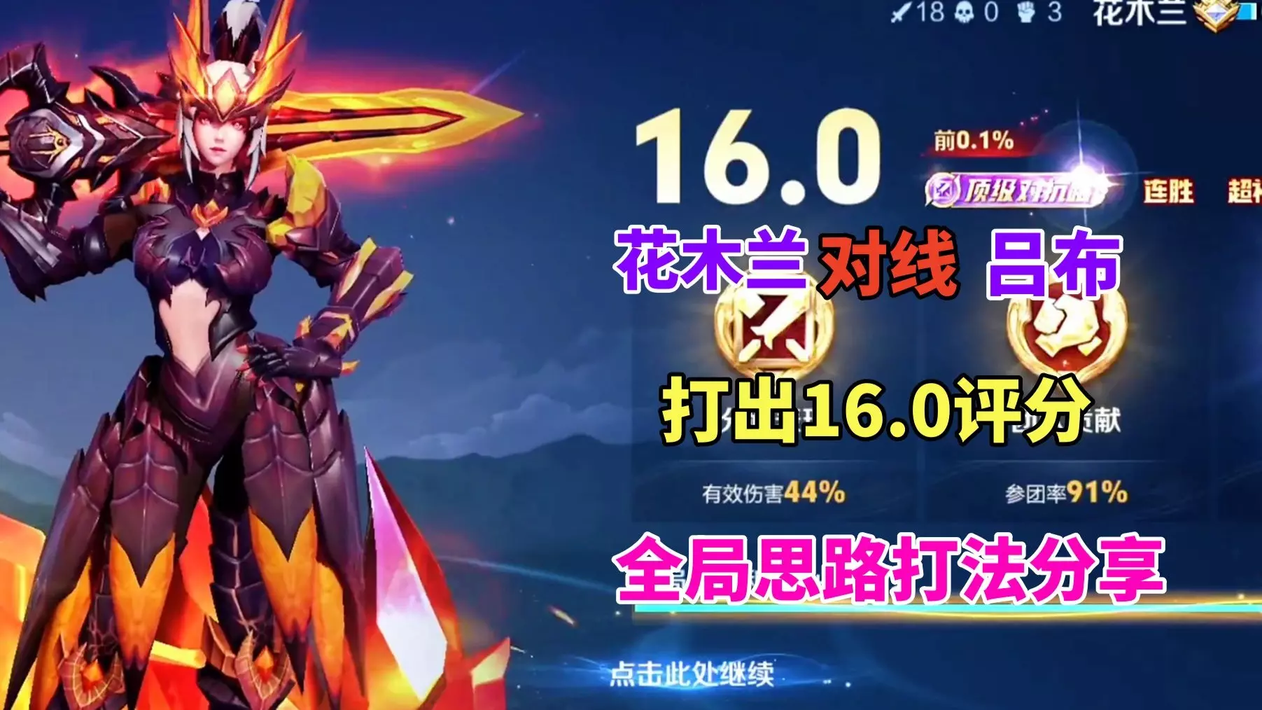 这是一期王者荣耀教学内容,展示了花木兰作为上单无限单杀曹操的对局,最终打出16.0评分拿下顶级对抗路,还带来了花木兰全局思路打法教学,帮助玩家掌握花木兰对抗路玩法。