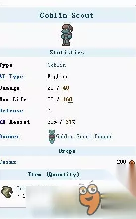 �哥布林入侵事件开始 当一次哥布林入侵将要开始时,会出现一条信息: “哥布林军团正在从[东边/西边]接近!” 这条信息会重复多次(小型世界4次,中型世界5次,大型世界6次)。这个信息所说的方向只适用于此次哥布林入侵的第一波,第一波哥布林刷新在世界边缘,然后旅行到玩家的初始出生点。如果玩家在初始出生点附近,其它波的哥布林会直接刷新在附近。 如果信息说“西边”,第一波哥布林将从左边来。如果信息说“东边”,它们将从右边到达。注意这些方向与太阳和月亮表面上的运行无关,在泰拉瑞亚中,太阳和月亮出现在左边(“西边”),移动到右边(“东边”)。 当哥布林军团将要刷新在玩家的初始出生点附近时,会出现如下信息: 哥布林军团到达了! ,然后主题音乐将转换成"Boss 1." 哥布林军团怪物: 哥布林劳工:一个基本的哥布林,可以通过单块垂直空间和分解木门。泰拉瑞亚哥布林苦工掉落什么 哥布林军团怪物属性解析 哥布林大军:可以通过单块垂直空间和分解木门 哥布林盗贼:跑得更快,跳得更高。泰拉瑞亚哥布林盗贼掉落什么 哥布林军团怪物属性解析 哥布林战士:生命值更高,攻击防御更高,更难杀死。泰拉瑞亚哥布林战士掉落什么 哥布林军团怪物属性解析 哥布林射手:无脑射箭