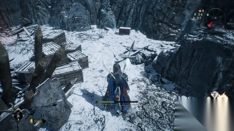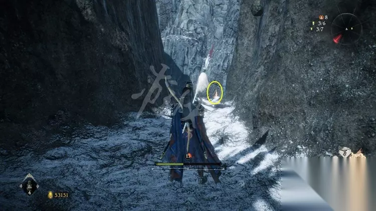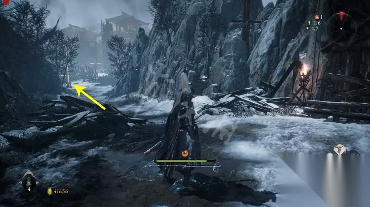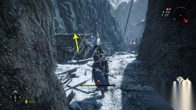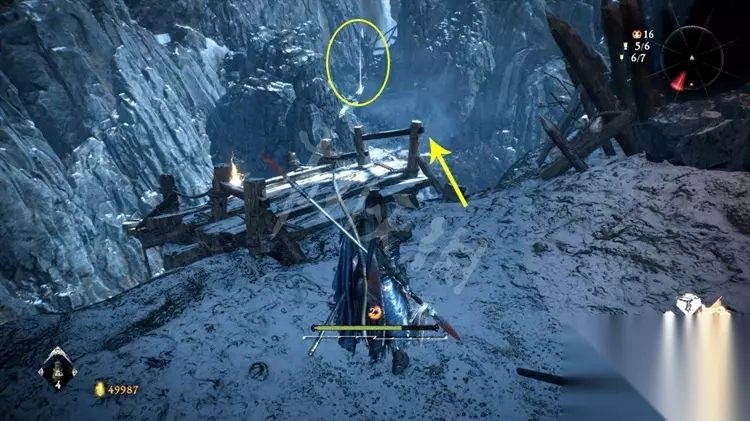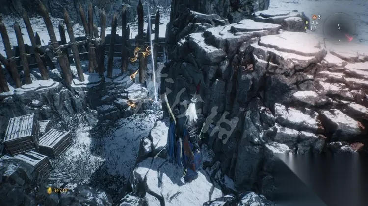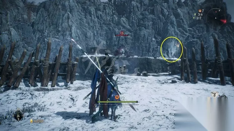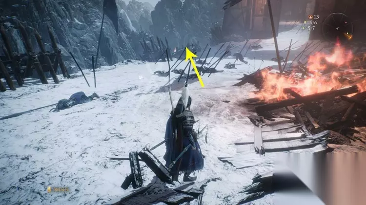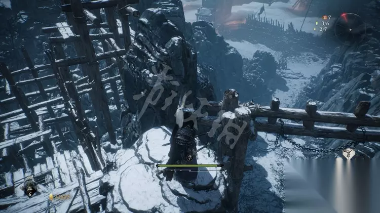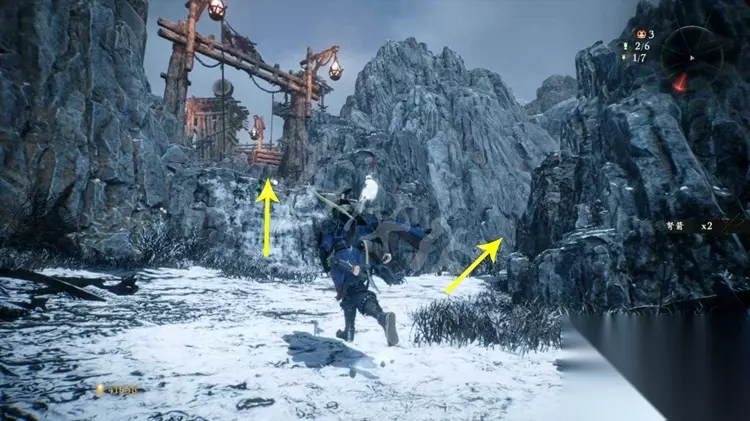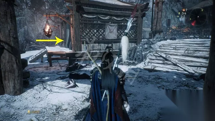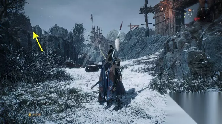 跳上石壁加入营寨地区,如下图先不进门往右边的小道走。