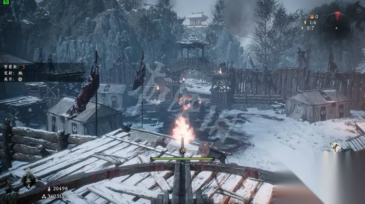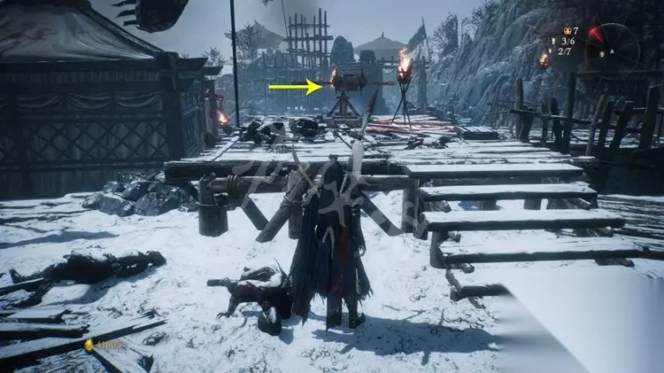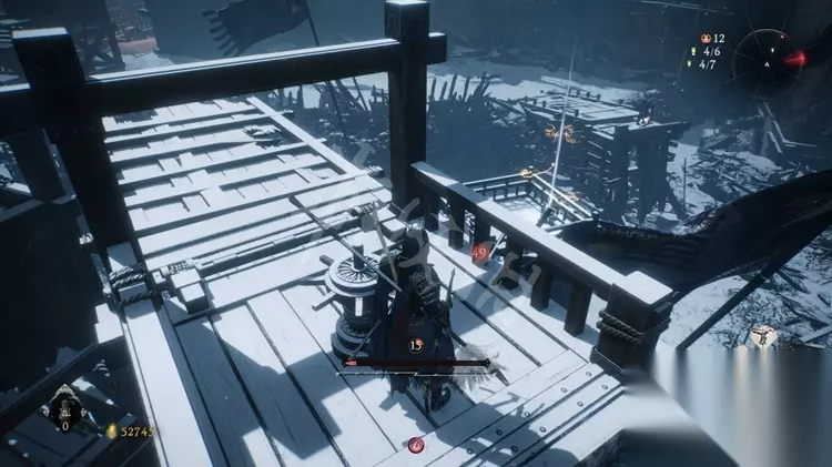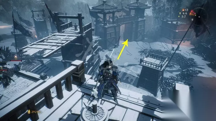 旗帜5: 走到该塔楼的一边,有一个床弩和两名兵士,灭亡兵士后跳到下方的平台。