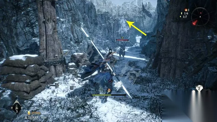 旗子6: 跳下关口,这里有很多攻城塔能够开启坎阱开通途径。 之后往下图标记的塔楼之间走。