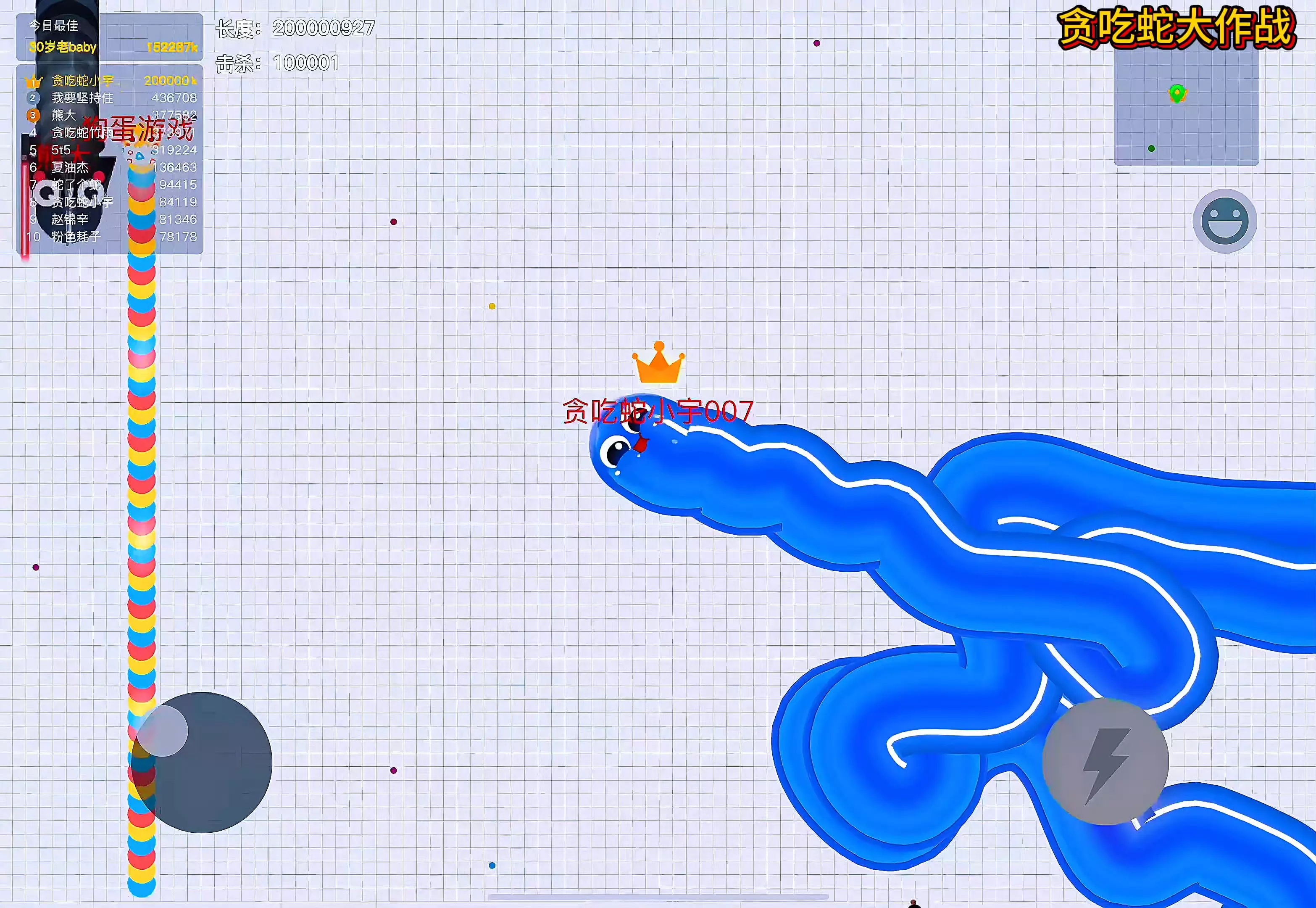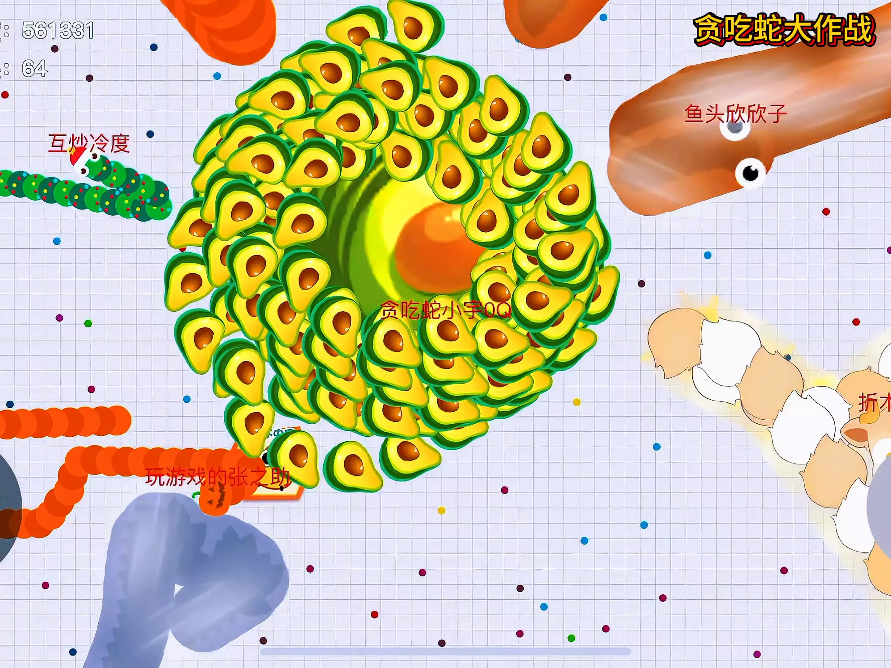 这是《贪吃蛇大作战》的游戏实况,展示了玩家操控的黄色贪吃蛇“贪吃蛇小宇007”的游戏过程,能看到蛇的长度不断变化,还有攻击牛油果造型大蛇的趣味玩法。