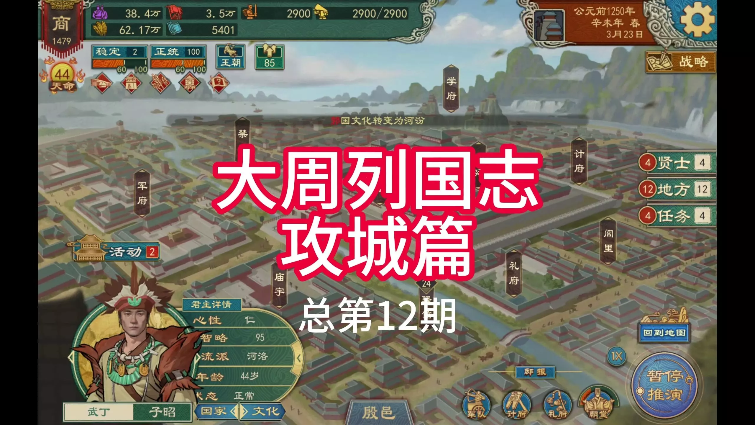 这是《大周列国志》的实况解说内容,围绕荒岛求生复大吴展开,展示了谍报秘录信息、大吴的发展情况,包括启用贤才、点科技树,还有宣战相关的外交动态等。