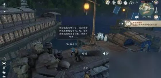 【一臂之力】 磁州1378.1099处与NPC“店小二”对话,结局“一臂之力”:选择“不接受”,结局“稚子闲趣”:选择“接受”,磁州1407.1122处与“杜娘”对话获取“剑穗”。