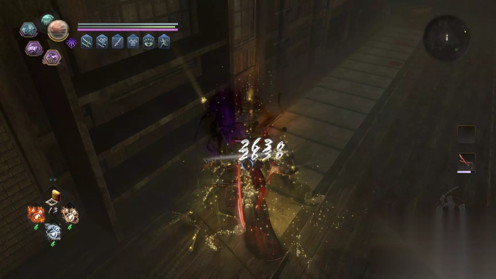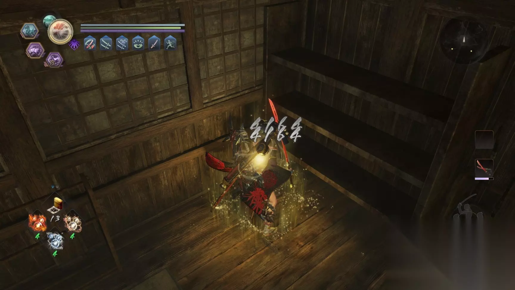 4.心眼:下段被动技能。在即将受到攻击时按闪避键,会额外闪避一段距离。衍生技心眼2会在成功触发心眼后短暂提升攻击力。攻防一体的神技。简单来讲就是增加了你的闪避无敌帧,提高了近身拼杀的容错率。 5.樱花:上段武技。速攻击后使出一招跳斩。崩解很强的技能,也可以用于破角,韧性也很高,基本可以强行崩解大部分敌人的态势。但出手较慢,适用性一般。 6.水形剑:上段武技。连续快速的斩击敌人。本作第一DPS武技,类似锁链的薮斩。在空精爆发期一套水形剑基本可以秒掉大部分敌人。也是双刀后期的第一输出手段。空精处决?真不熟。水形剑才是最大的快乐。但键位与野风有冲突,根据不同情况合理选择。
