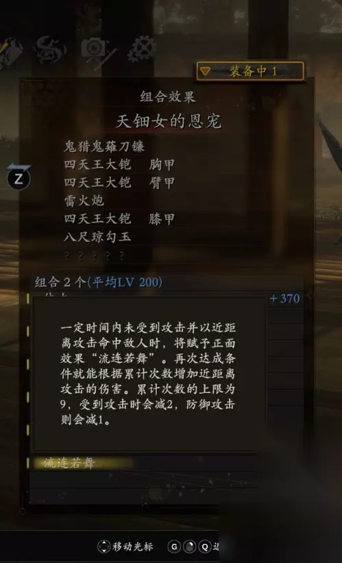 倒地追击的伤害为4164×2=8328。此时敌人并未空精,不应用染血双锲的空精增伤。 那么提升幅度为(8328-4751.58)÷4751.58≈75.26%,虽说有些装备词条上的影响,这个结果可能有些不太严谨,不过基本上与网络上流传的流连若舞70%增伤说法相差不大。 另外就是从天钿女的词条说明上可以看出,这个恩宠是鼓励玩家多进行闪避的,再加之流连若舞挨打或者格挡时都会掉层数,实战的难度并不低,在遇到铁鼠、风鬼或隐形鬼这种粪怪的时候,很难将层数叠高。不过由于只要攻击到敌人就能够触发,纵使层数不容易叠高,其覆盖率在战斗中基本上也是全程。 接下来是琼琼杵的套装效果
