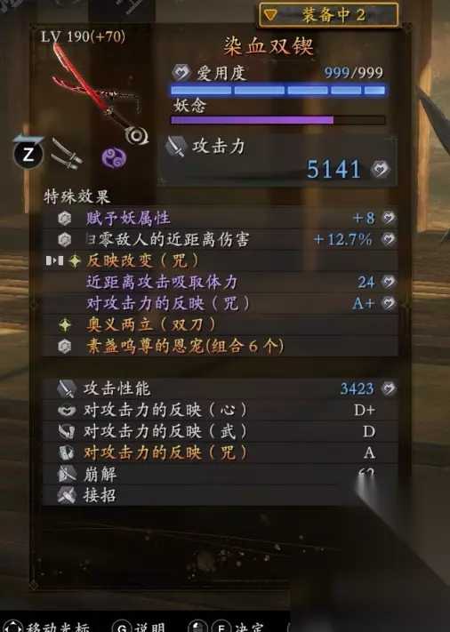 图中仅为参考值,实际数值以等级为准 拿到八尺琼勾玉或-1词条的饰品之后,可尝试6弁才天+5剑豪,将双刀的输出能力拉满。剑豪套的获取可以去修炼场找双刀师傅来刷制作书。 3.四五周目及奈落狱:把饰品洗出装备掉落的词条开刷就行了。 双刀流优先绘卷词条:咒勇体深奥不再赘述,琼7素6可刷武深奥。刚深奥刷不出可以放弃,具体原因下面会讲。 双刀优先底子:染血双锲(空精增伤),优先词条:反映改变咒、星号精力伤害、星号攻击反映咒、奥义两立。