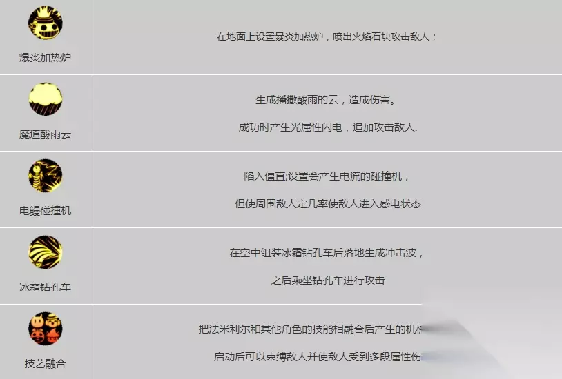 详解: 职业加点通用小技能后跳蹲伏暴击普通攻击等。 最主要的是这个图标猎头锤普通攻击时,用武器下劈敌人头部攻击落空时,会使自身失去浮力并跌倒极闪手游中的通用技能可在倒地或不脱手技能,释放途中使用,每十秒恢复一次,可使用次数最高续能两次是一个全职业都有的保命技能。 魔法盾:这个技能在手游中是被动技能直接减少所受伤害,有些怕操作不好的兄弟可以把它叠满十级之后,就是魔道的转职系技能了。 远岩加热炉:输出高范围大,还可通过滑动来指定喷射技能。 魔幻粉末:在手游中是被动技能随人物等级提升而提升效果。 为强化普通攻击,远古魔法书有增加智力,减少敌人防御力的效果。 伞与云和暗影斗篷以及buff魔法秀魔法秀的效果是冷却时间减少以及释放速度增加,冷却时间六十秒,持续时间四十五秒。 二十五级技能:变异苍蝇派、幸运棒棒糖。 幸运棒棒糖持续时间四十五秒,冷却时间六十秒,提高打成功率的次数。 三十级技能:熔岩药瓶、体术技能。 龙牙龙牙下面的是被动技能,龙牙棍就是在龙牙攻击成功后,发动圆武棍三十五级技能旋转, 扫把和电鳗碰撞机旋转扫把高将值高伤害的体速攻击。 电鳗碰撞机光属性攻击不脱手的放置型,持续输出技能能对范围内的敌人进行控制,是个控制型超强的技能。 四十级技能:反重力装置瞬间输出技能大成功时,会将敌人击飞落地后,形成冲击波伤害魔道,学者少有的瞬间爆发技能。 四十五级技能:冰霜钻孔车,俗称冰车总体输出还是挺可观的,功能也也不错。 五十级觉醒技能记忆融合,带有吸附和束缚效果,控制控制效果非常好,成功预感增加魔法暴击和暴击伤害,且增加大成功能。 关键字: DNF手游