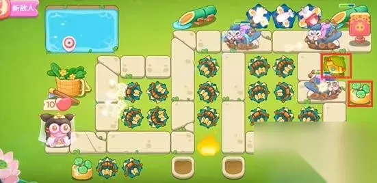 2、在第二波敌人出现时,按照图中的布局放置多重箭,第二波开始将出现新的敌人——火兔子,火焰的位置不能放置炮塔,只能等待火焰熄灭才能放置。