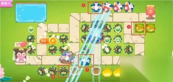 3、按照图中的序号顺序,分别放置多重箭和飞机,不仅可以清除上面的障碍物,还可以补充伤害输出。