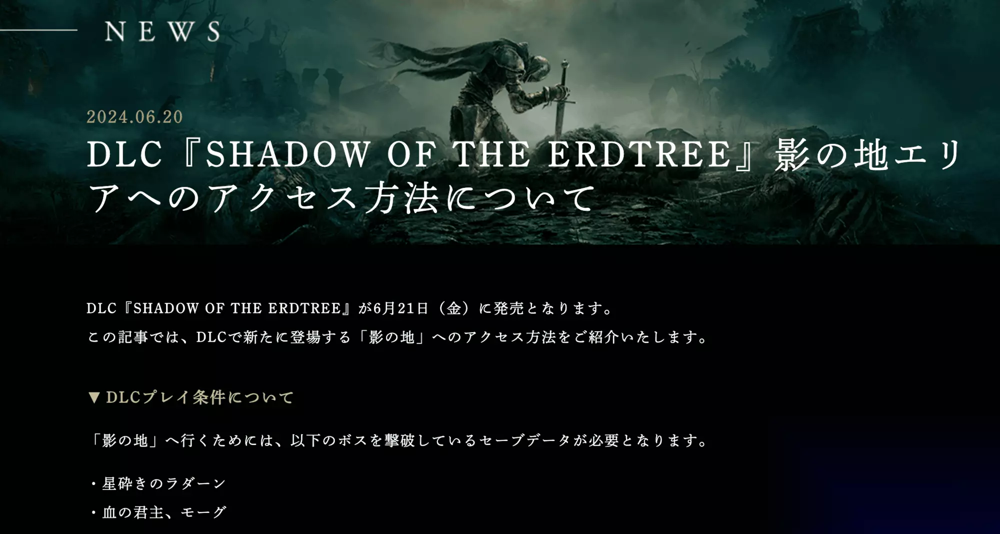 《艾尔登法环》的DLC《黄金树幽影》将于明天正式上线。今天,FromSoftware通过官方渠道介绍了玩家如何进入该DLC内容。