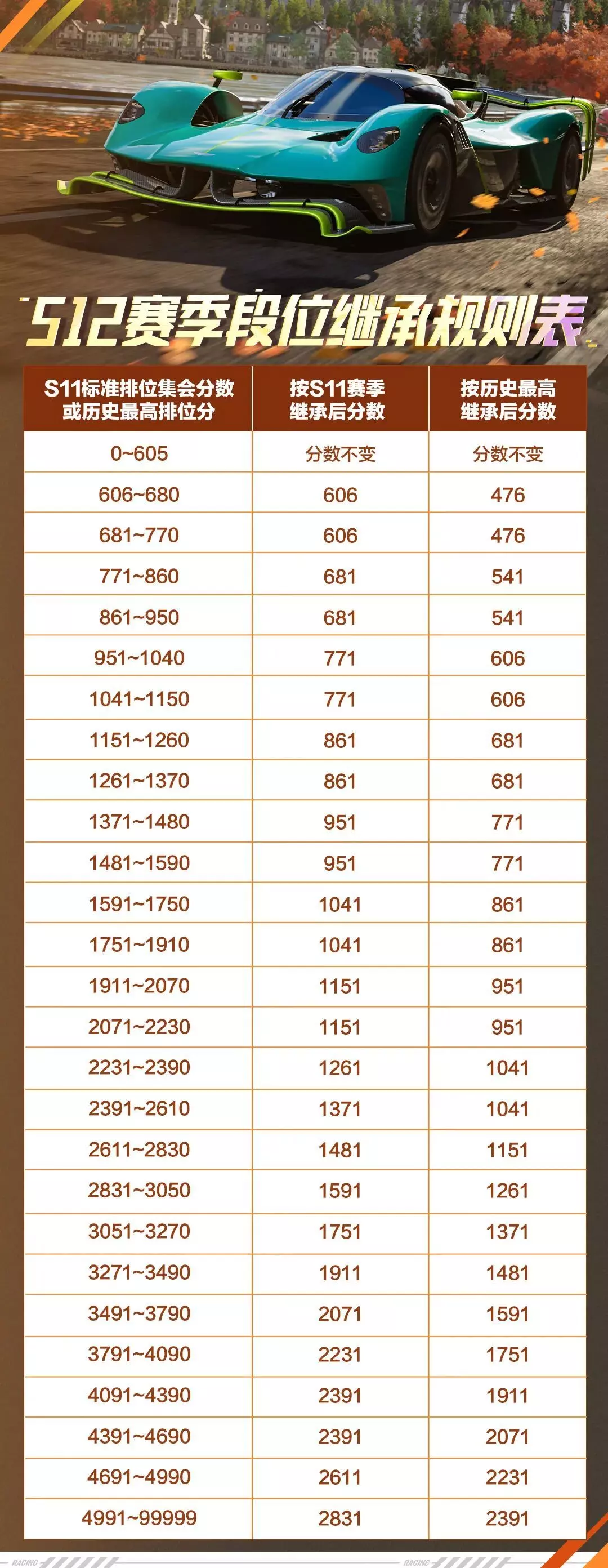 在S12赛季开启时,「限定排位」与「巅峰排位」分的继承规则保持不变。「圈速赛排位」分则不再继承,将在S12新赛季中重置。