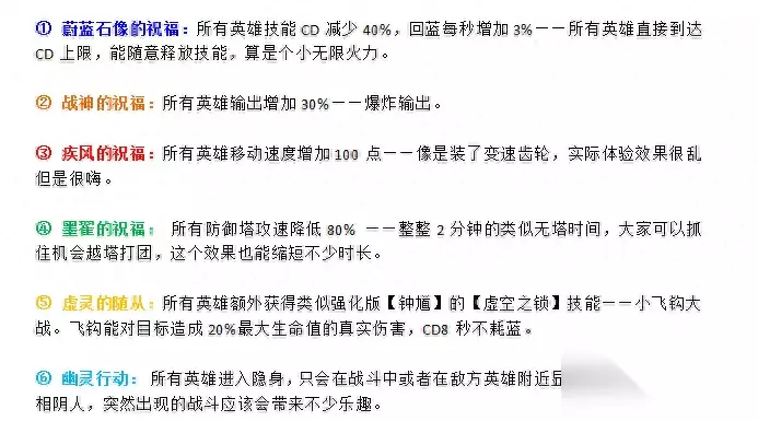 游戏开始后,每隔两分钟地图上就会刷新不同的BUFF并在屏幕右上角给出提示。BUFF效果随机,玩家需要根据BUFF得效果来调整自己的玩法,这就需要玩家有敏捷的反应能力。 3)可以被随机到的地图BUFF效果如下:(每个效果都是持续2分钟)