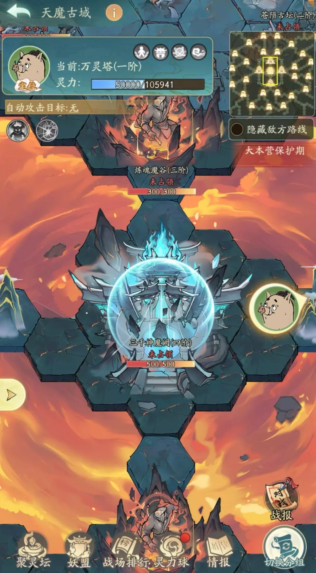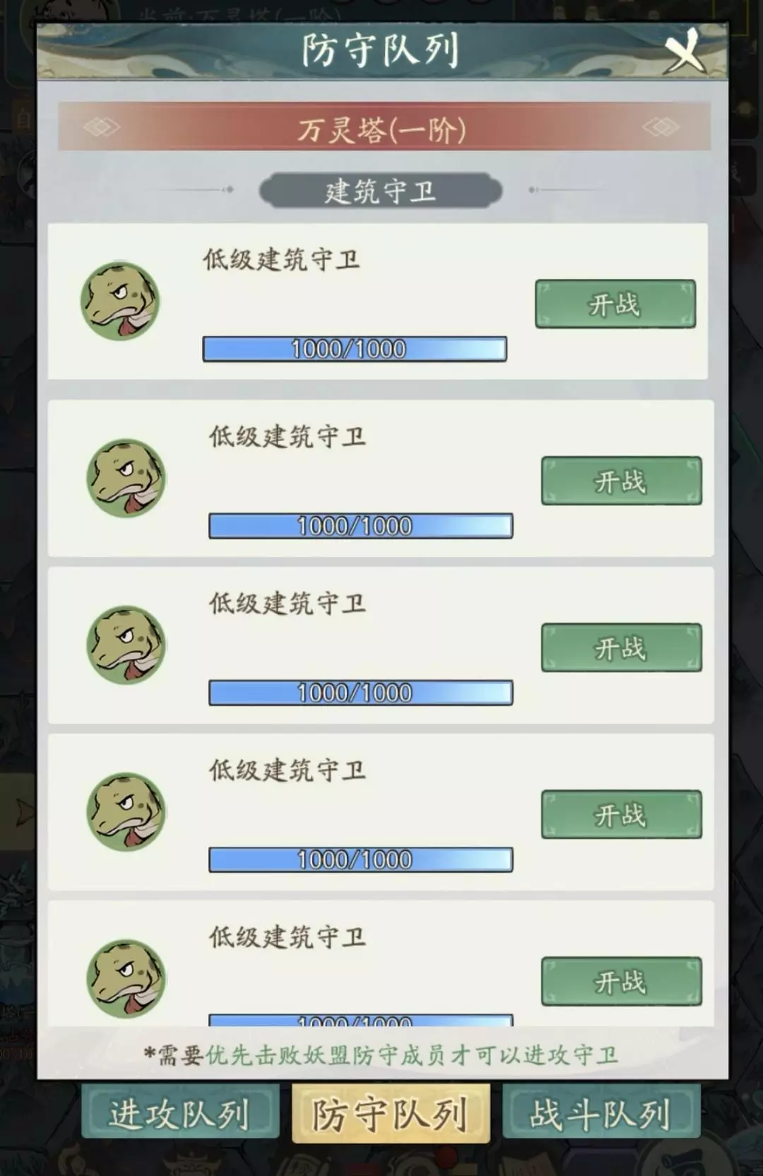 每个建筑均有守卫把守,每击败1个守卫,建筑生命值减少1,当建筑生命为0的时,完成最后一击的妖盟占领该建筑,并且该建筑生命值重置。