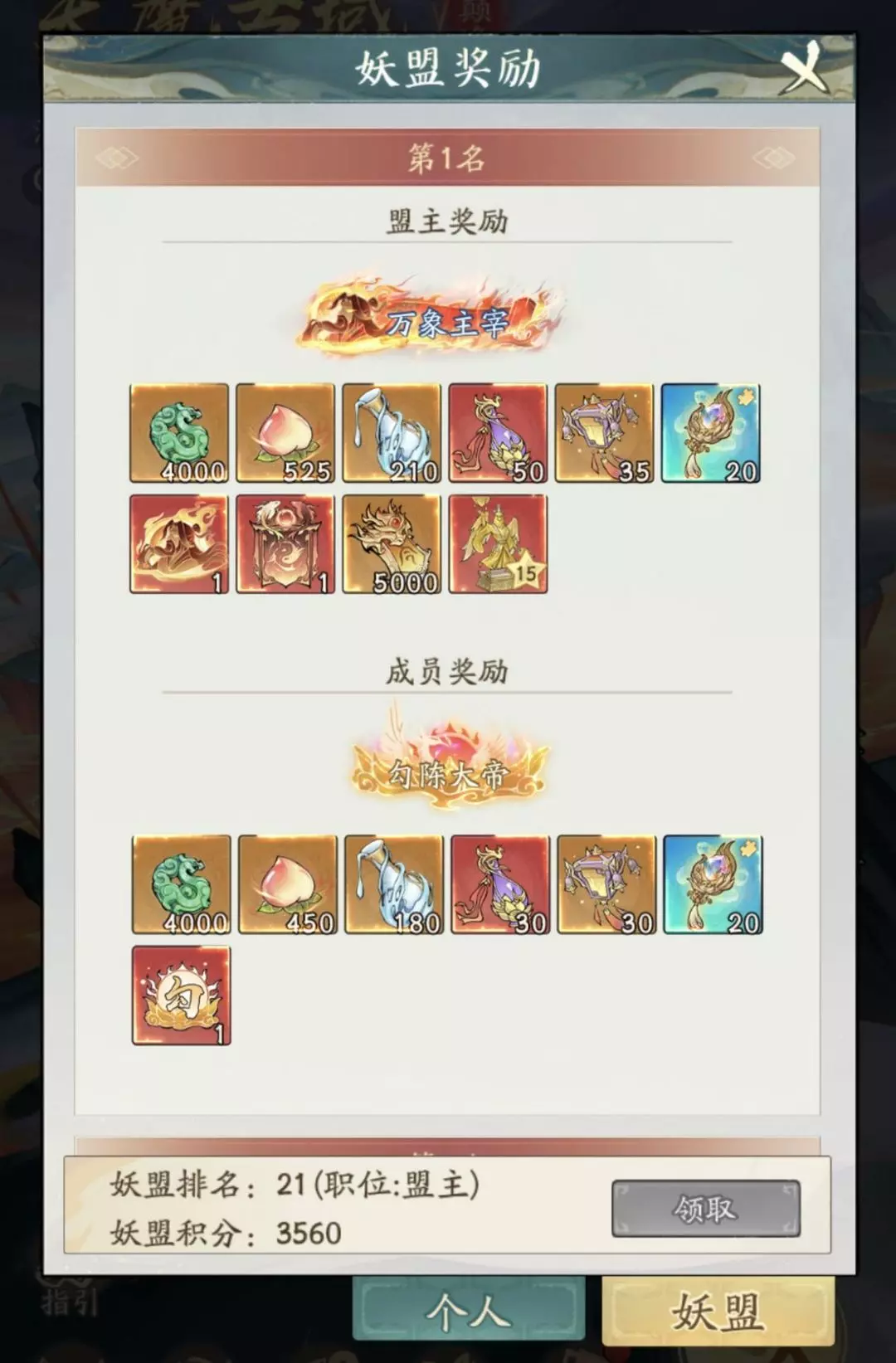 活动结束后,将根据道友获得的总战功值进行排名;妖盟则根据不同轮次获得的积分之和进行排名。排名第一的妖盟还将获得全员仙官以及全新造化至宝碎片奖励!