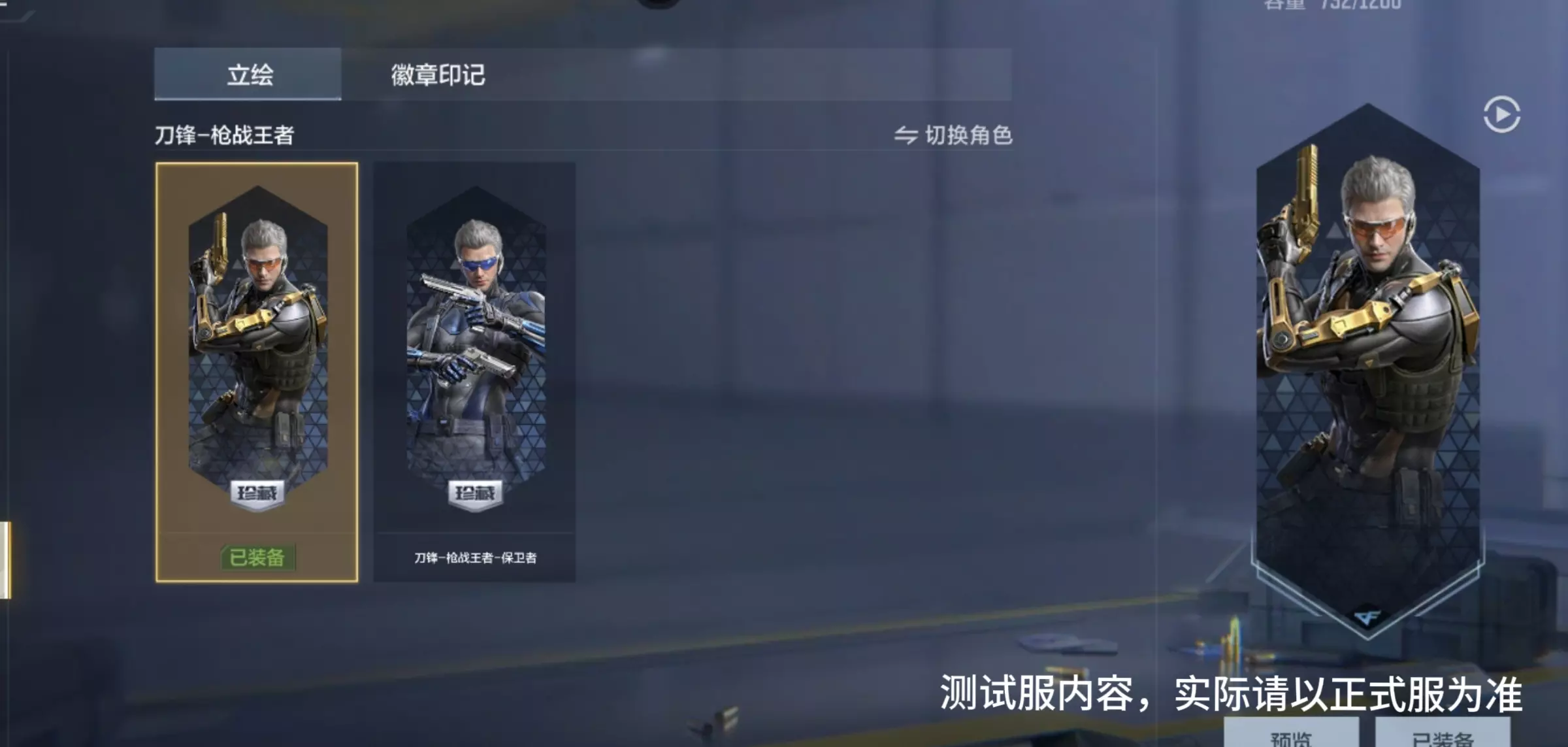 刀锋-枪线王者共有保卫者以及潜伏者两种形态,并且拥有专属展示动作:刀锋-枪战王者持双枪而来,两把武器在其手中挥舞转动,随后收枪,轻点设置战术护目镜后保持站立姿态,音效与动作十分契合。