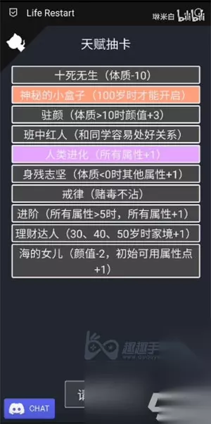 其次就是关键,需要你有这个神秘的小盒子,就是橙色天赋,然后才能够让你在90多岁的时候活下来。这个小盒子需要你刷新天赋,就是需要刷个100次才有可能,因为正版的概率为0.1。 这两个缺一不可,首先体质高是能保证你活到90岁的前提,其次就是小盒子可以让你从90岁到100岁,保证了这两点,才能够让你顺利活到100岁。
