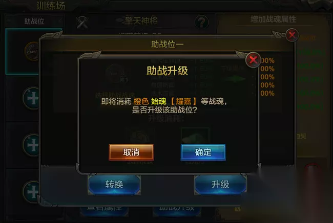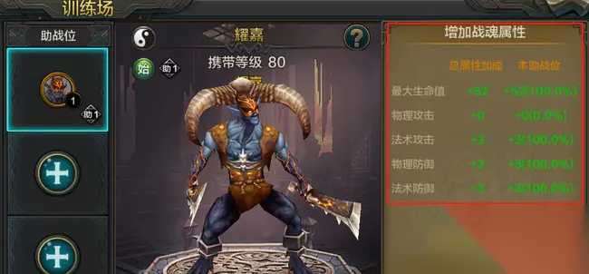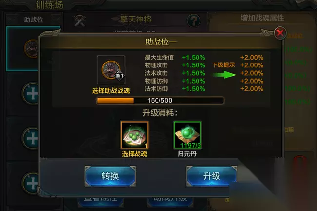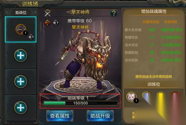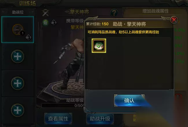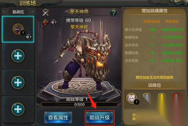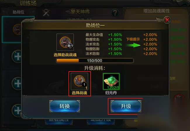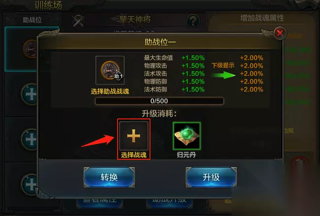 其次,需要确保上阵的助战战魂未穿戴战魂装备。以上条件都满足即可放置在助战位进行培养。 三、放置助战魂并进行培养 选择好合适的战魂后,英雄们可点击助战升级进行培养升级,提升属性提升。 选择同品质战魂进行消耗(吃),提升助战等级。助战等级越高,对训练战魂的属性加成越高。 消耗的战魂阶数越高,提供的助战经验越多,如果嫌麻烦也可以直接消耗始魂。