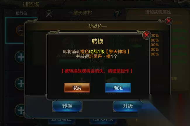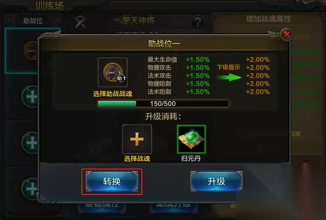 想替换更好的助战战魂如何操作? 助战等级巧迁移 不少英雄在不断更替战魂后,会有更好的助战战魂进行上阵。但碍于助战位已有助战等级在,不方便转移。 不用担心,英雄们可以通过“转换玩法”进行助战等级转换。这里需要强调的是,转换玩法仅限于同品质战魂之间。 如:原本为红色品质的战魂,进行转换后,所得的道具仅用于提升同品质战魂的助战等级~,不能越级提升,也不能降级提升哈。 点击助战升级-转换,即可找到转换玩法。根据现有助战等级的不同,获得得产物数量和品质也不相同。 女娲以橙色战魂为例,英雄们可以通过转换获取“沉灵丹*若干”。