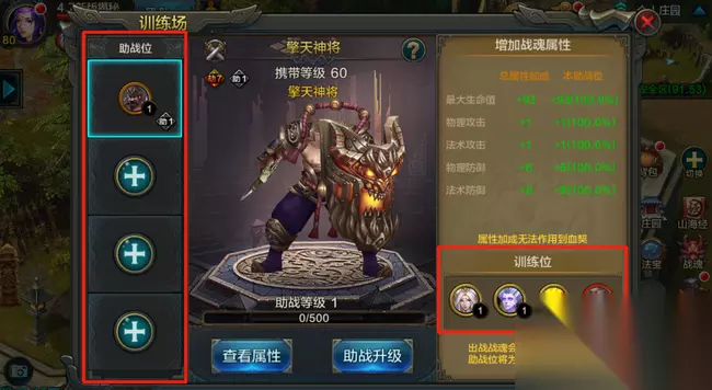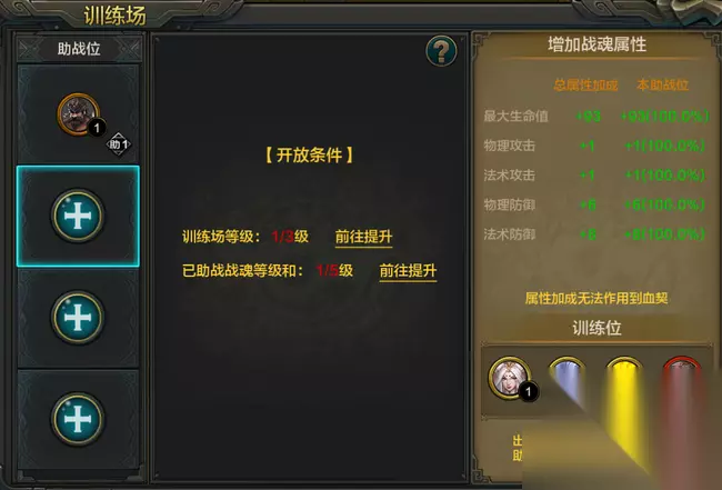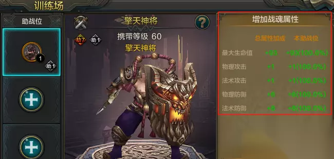 训练场分为两个操作区:助战位,训练位 助战位: 通过训练玩法提升训练位战魂属性,包括生命值,攻击力以及防御力。 训练位: 放置被训练的战魂,通过训练提升训练位战魂的能力。默认训练位为英雄们的出战战魂。