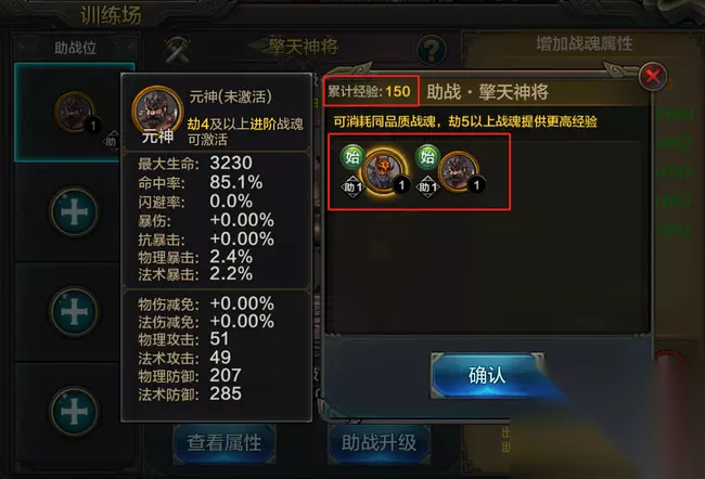 确认选择的战魂数量以及消耗产物,即可点击升级进行助战等级提升了。 请英雄们仔细检查需要消耗的战魂,避免误操作哦~女娲也会为此多准备一层确认弹窗给英雄们二次确认避免手滑。