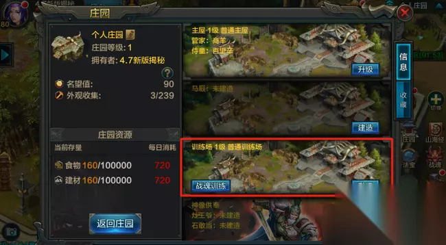 全新版本将带您一同体验战魂训练全过程,提升个人能力的同时也不要忘记训练它们哦! 全新个人庄园玩法-战魂训练场开启训练之旅, 升级主屋建造训练场 开启战魂训练之旅 全新4.7版本更新后,英雄们若还没有建造训练场,请完成升级主屋后建造起来,因为战魂训练玩法汇聚于英雄个人庄园中。 当训练场解锁后,英雄们可以通过点击训练或走进训练场点击对话进入训练玩法。