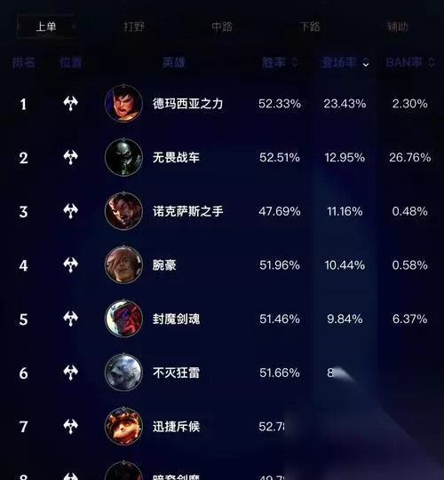 达里乌斯作为一名高爆发输出的战士英雄,具备强大的近身攻击能力和生存能力。 2.“疾风剑豪”亚索引领风潮,成为上单首选 亚索凭借其高机动性和出色的技能组合,成为上单玩家的首选之一。 3.“无双剑姬”菲奥娜在新版本中崭露头角 4.“诡术妖姬”乐芙兰-强势上单的新宠儿 乐芙兰凭借其诡异的技能组合和强大的控制能力,成为新版本中备受青睐的上单英雄。 5.“复仇焰魂”赛恩-独特打法引爆新的热潮 6.“无情之锤”露丝塔娜-坦克型上单的最佳选择 露丝塔娜作为一名坦克型上单英雄,凭借其出色的生存能力和控制能力,在新版本中表现出色。 7.“暗黑元首”摩尔加尔-法术输出上单的不二之选 摩尔加尔以其强大的法术输出和控制能力,成为法术输出上单玩家的首选之一。 8.“疾行之风”奎因-高机动性打破传统战士定式 奎因凭借其高机动性和爆发伤害,打破了传统战士定式,在新版本中展现出强大的实力。 9.“不祥之刃”亚托克斯-高爆发输出威力惊人 亚托克斯以其高爆发输出和生存能力,成为新版本中备受瞩目的上单英雄之一。 10.“河流之王”纳尔-坦克上单的最佳选择 纳尔以其强大的坦克属性和生存能力,成为坦克型上单玩家的首选之一。 11.新版本T1级强势上单英雄出装攻略 为了更好地发挥上单英雄的实力,合理的出装是至关重要的。本节将为大家介绍每个英雄的出装攻略。 12.刀枪如梦!新版本上单打野共通出装推荐 除了个别英雄的特殊出装外,新版本中有一些共通的出装推荐,适用于大多数上单英雄。 13.上单英雄对线技巧与应对策略 除了选择合适的英雄和出装外,对线技巧和应对策略也是决定胜负的关键。 14.如何在上单发挥T1级强势 T1级强势上单并不仅仅依赖于英雄和出装,更需要玩家在游戏中的操作和意识。 15.新版本T1级强势上单英雄多样性大增 新版本中,T1级强势上单英雄的种类与以往相比更加多样化,玩家们在选择时需根据个人喜好和实际情况进行判断。同时,合理的出装和技巧的掌握也是成为顶尖上单玩家的重要因素。