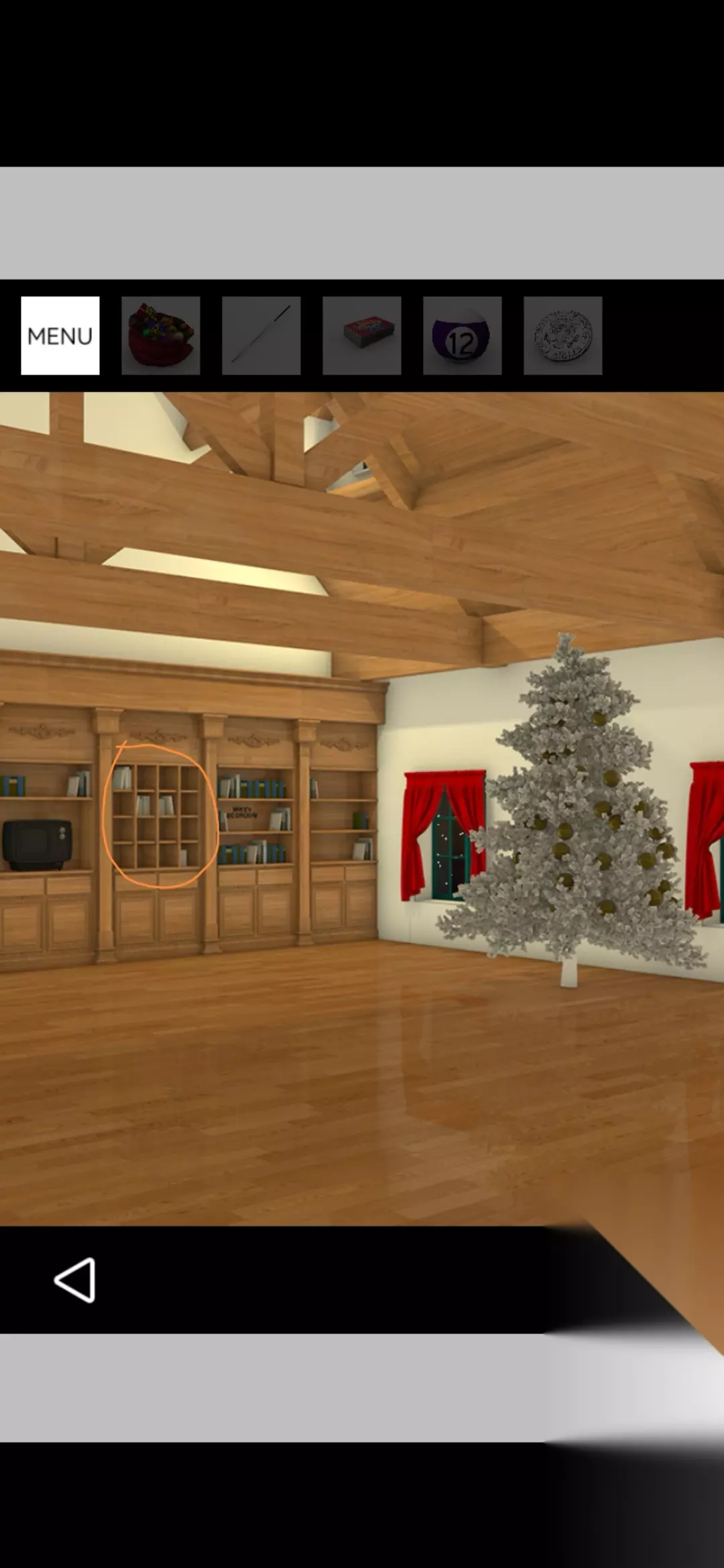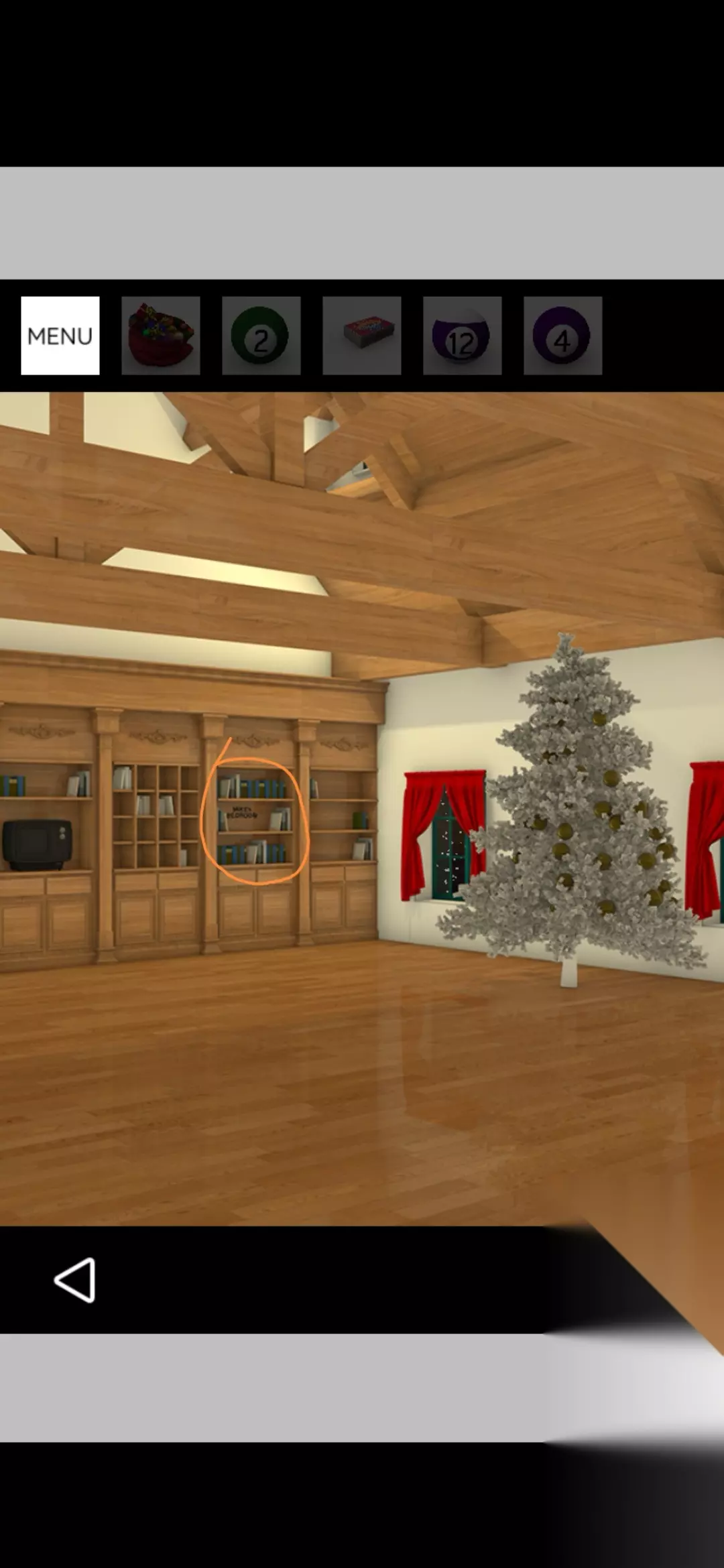 点击图中书架,把球按图中顺序放置打开密室的门,点击放大礼物堆得到礼物,点击桌面上的信件放上礼物得到火柴