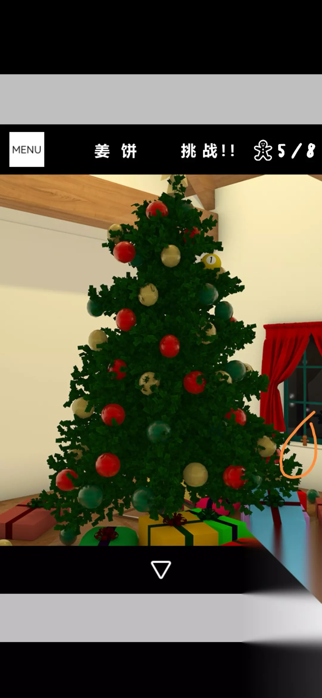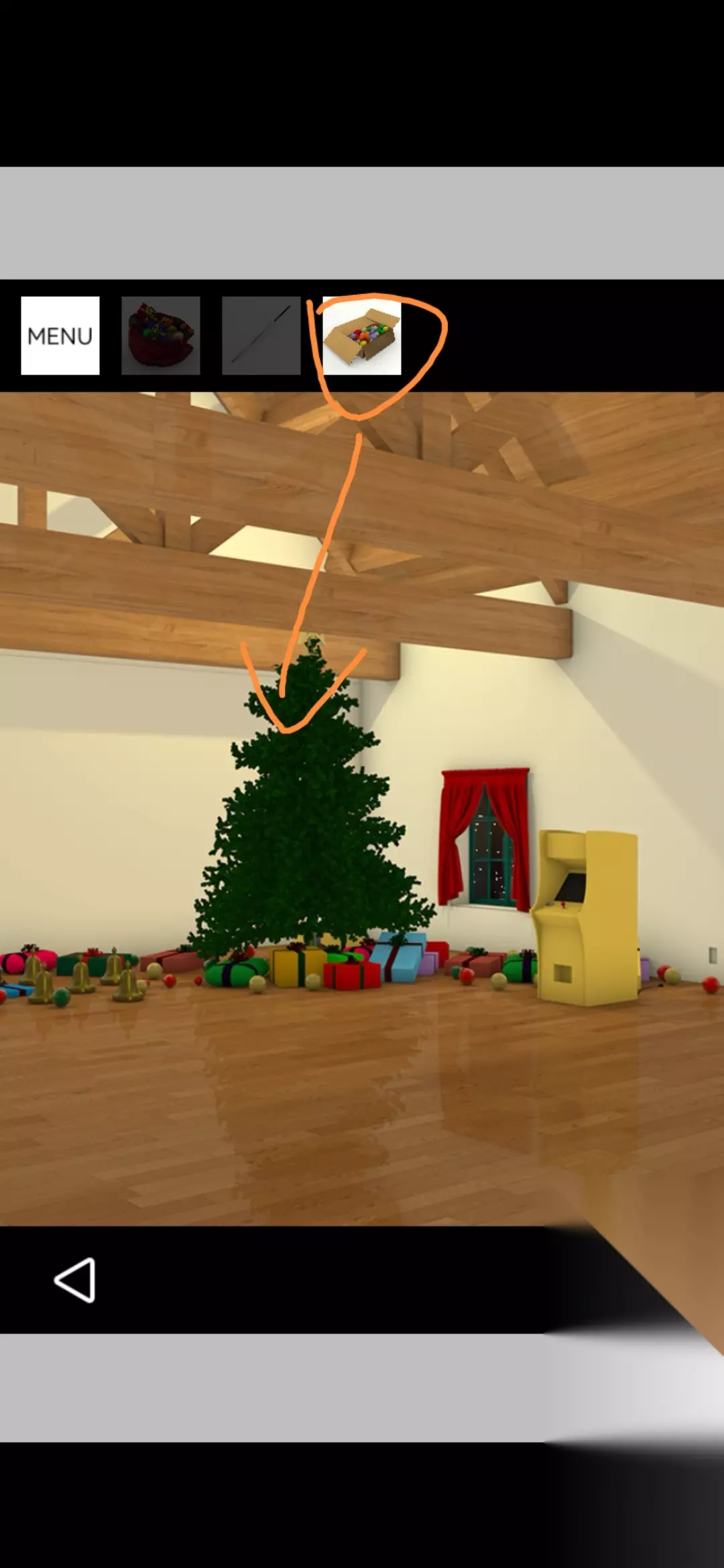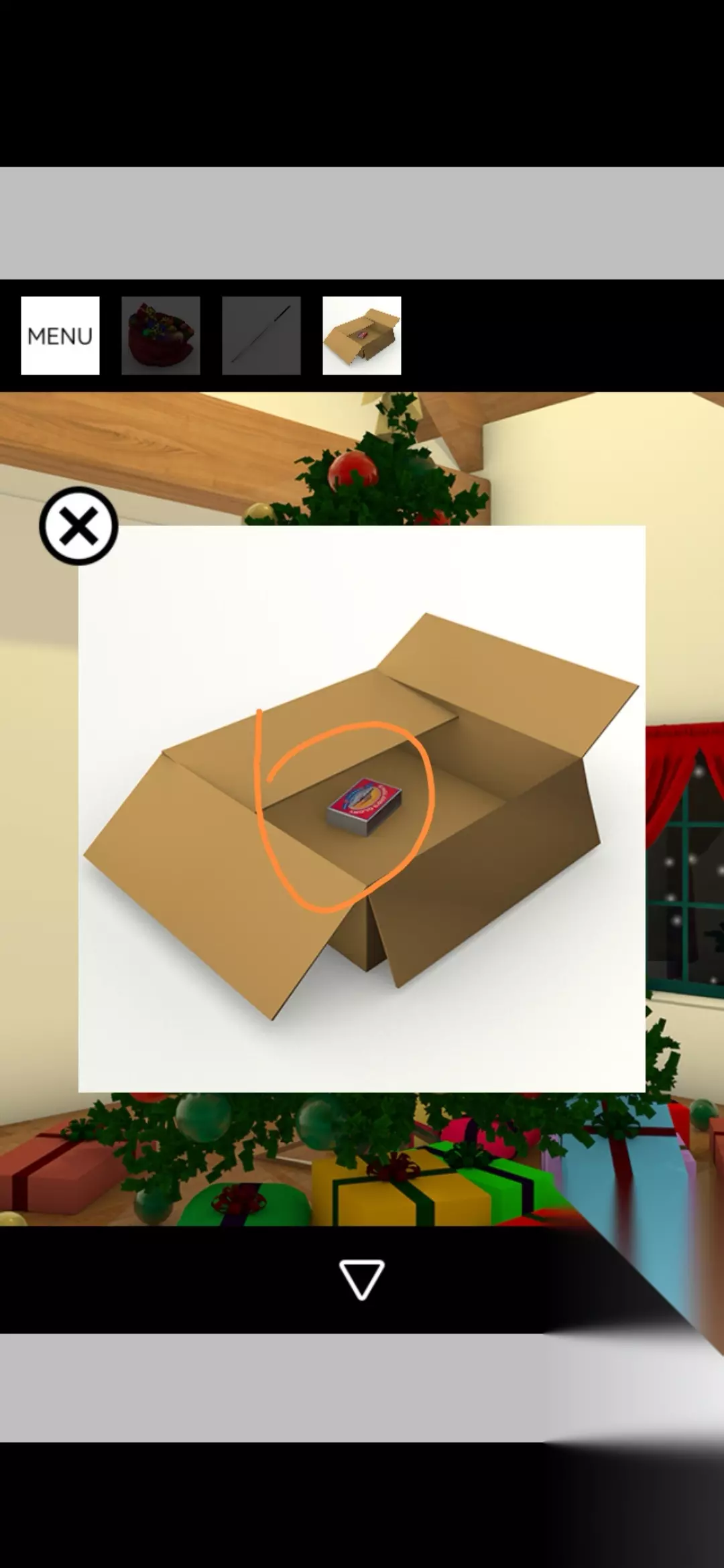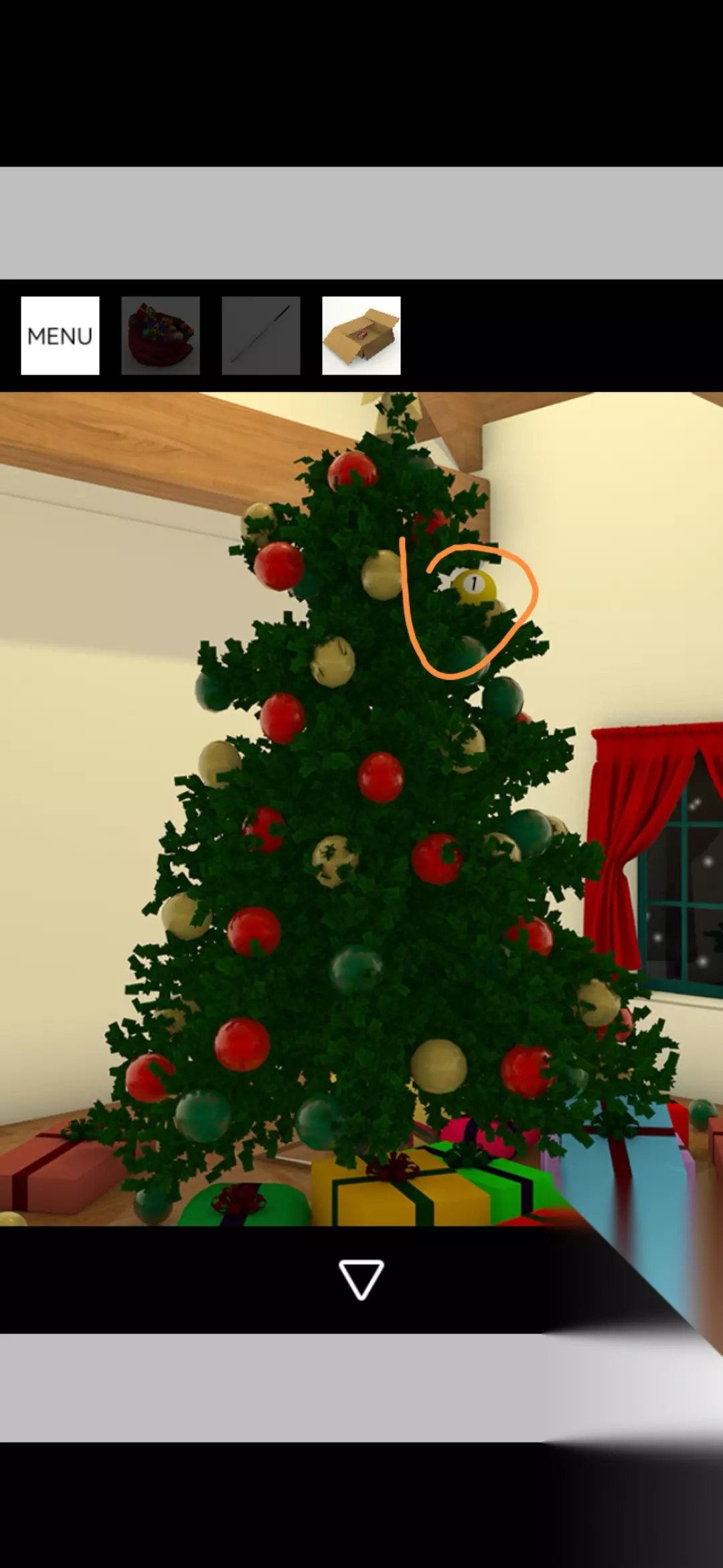 点击拾取图中装饰球盒,把球挂在圣诞树上,点击放大得到提示黄1,放大剩下的空盒得到火柴盒