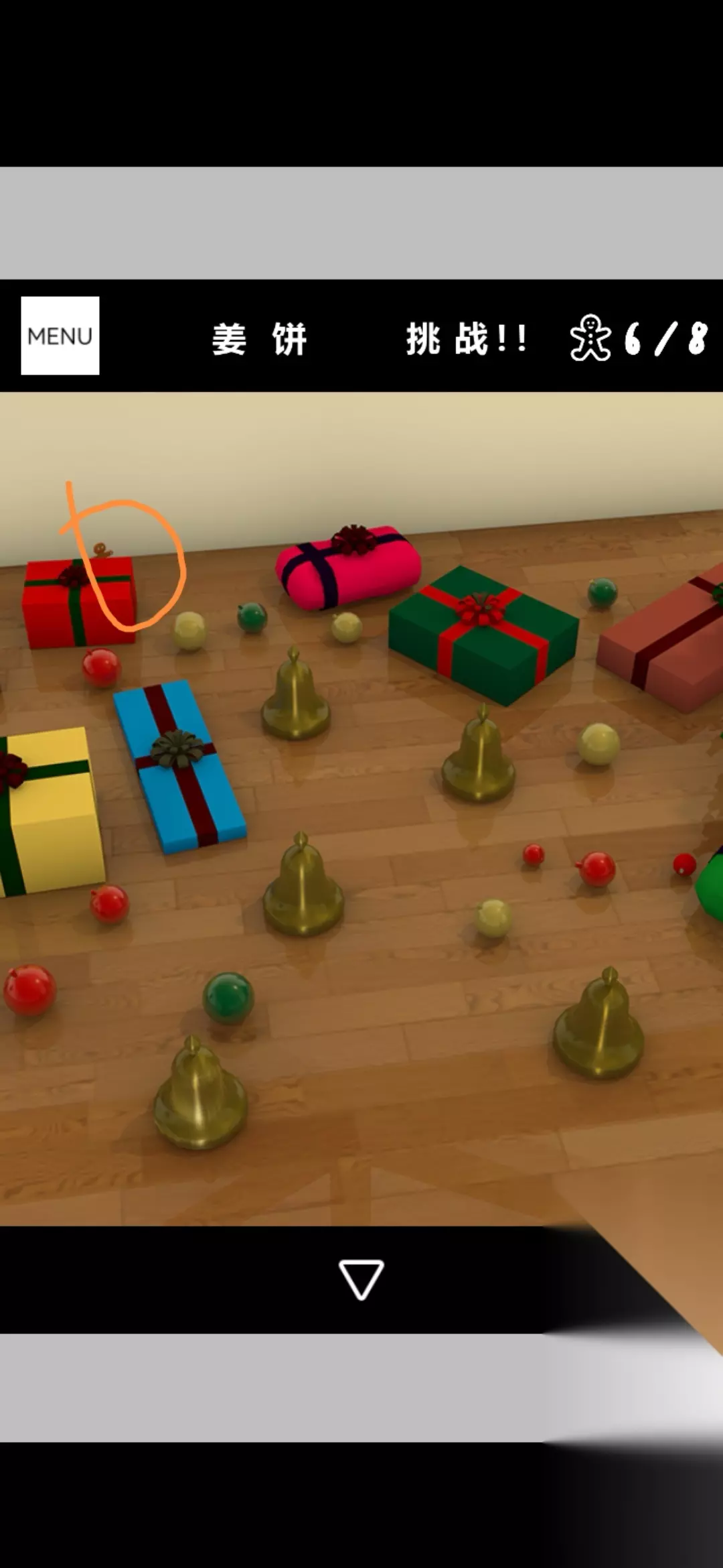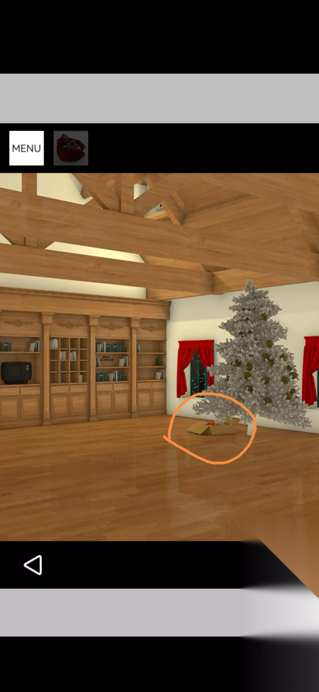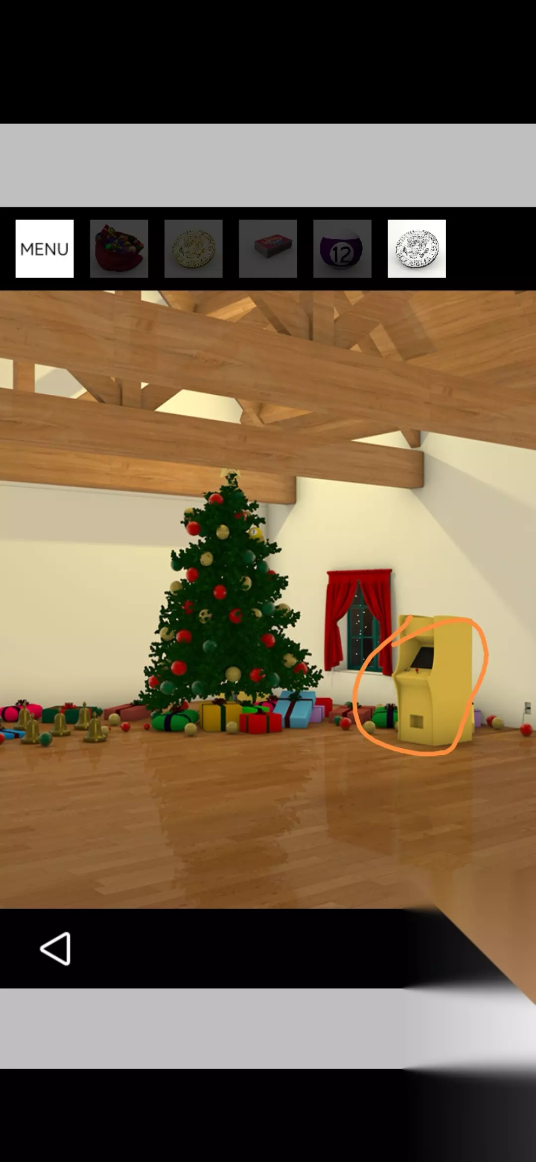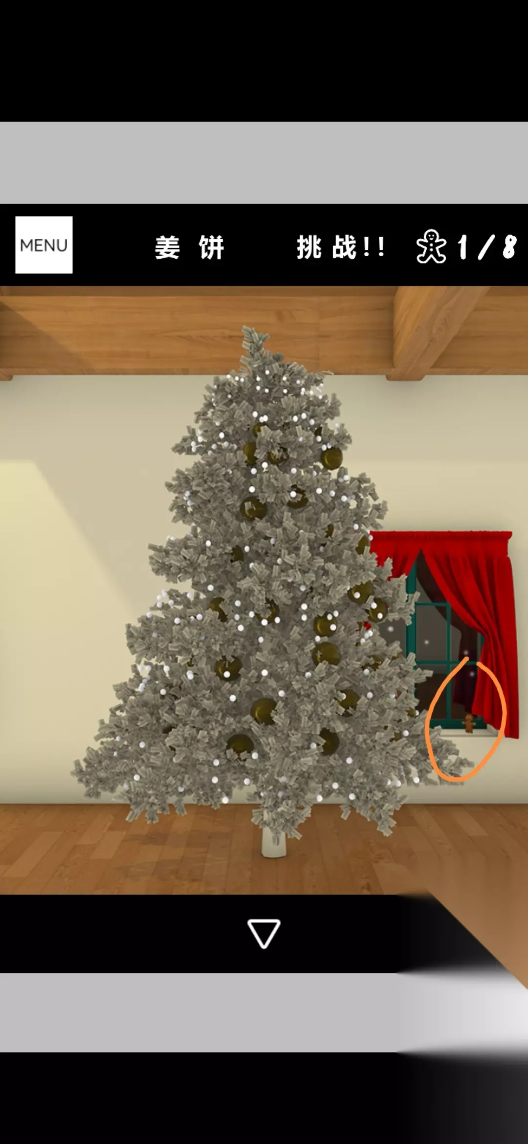 点击拾取图中装饰球盒,把球挂在圣诞树上,点击放大得到提示黄1,放大剩下的空盒得到火柴盒