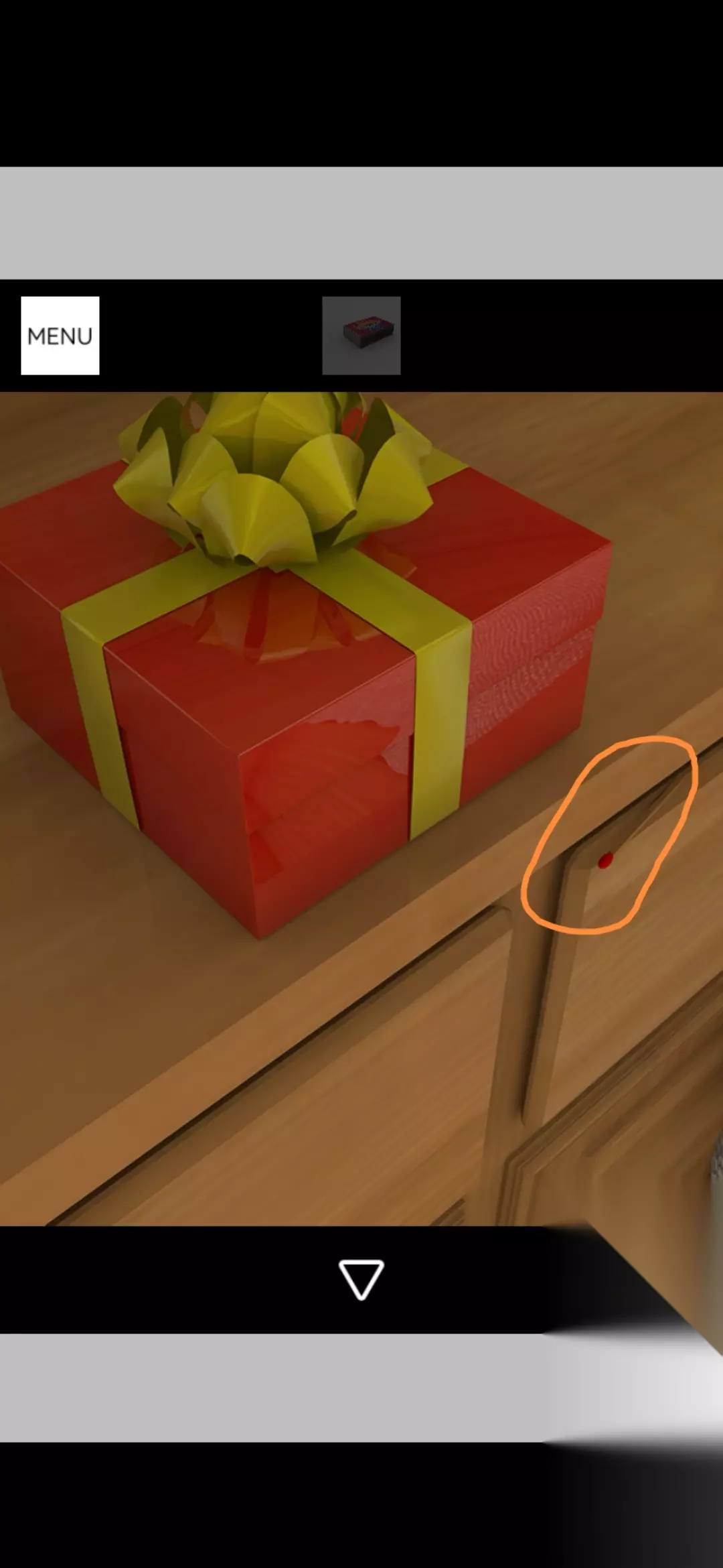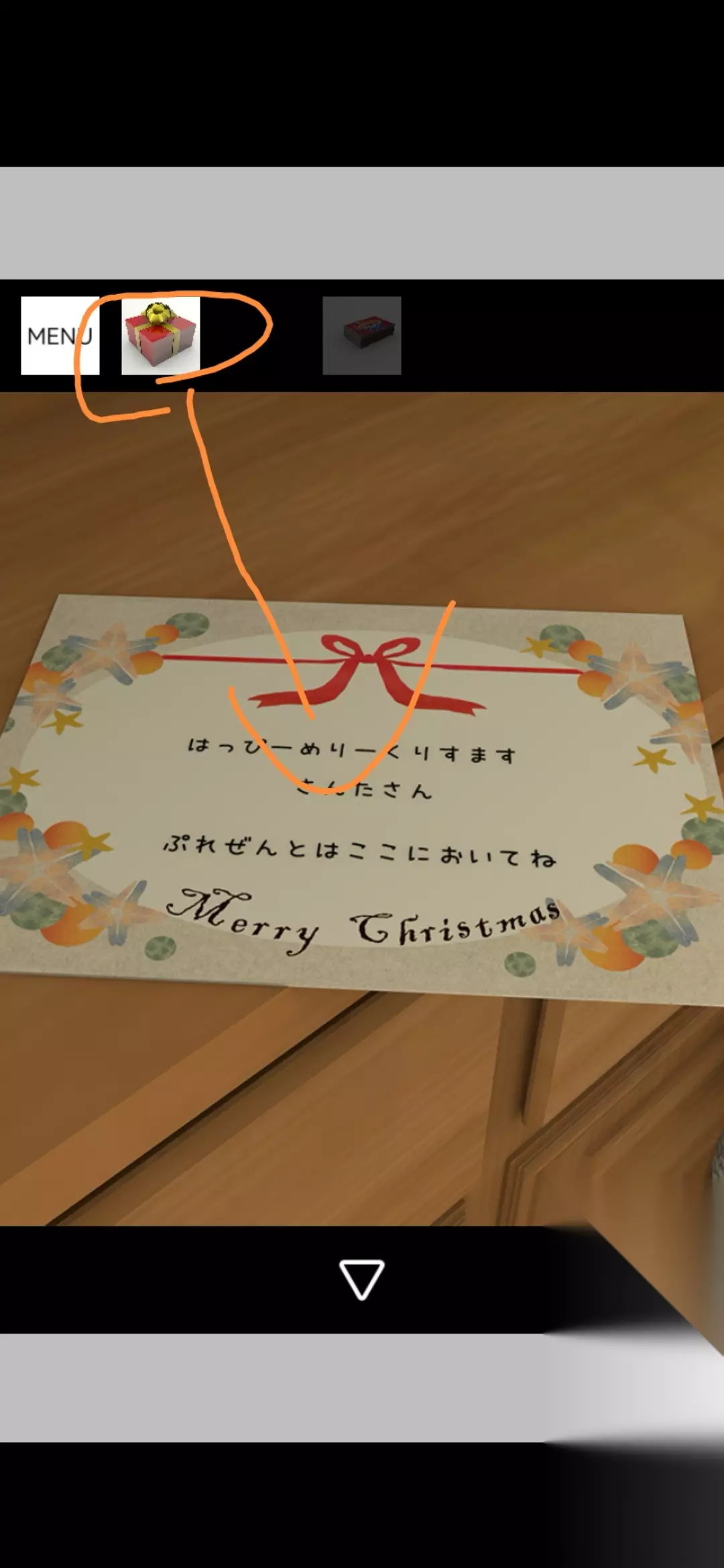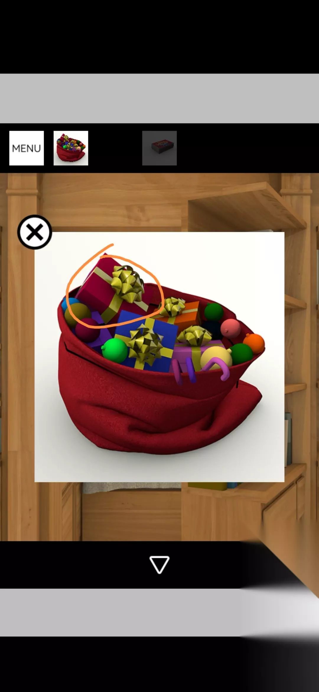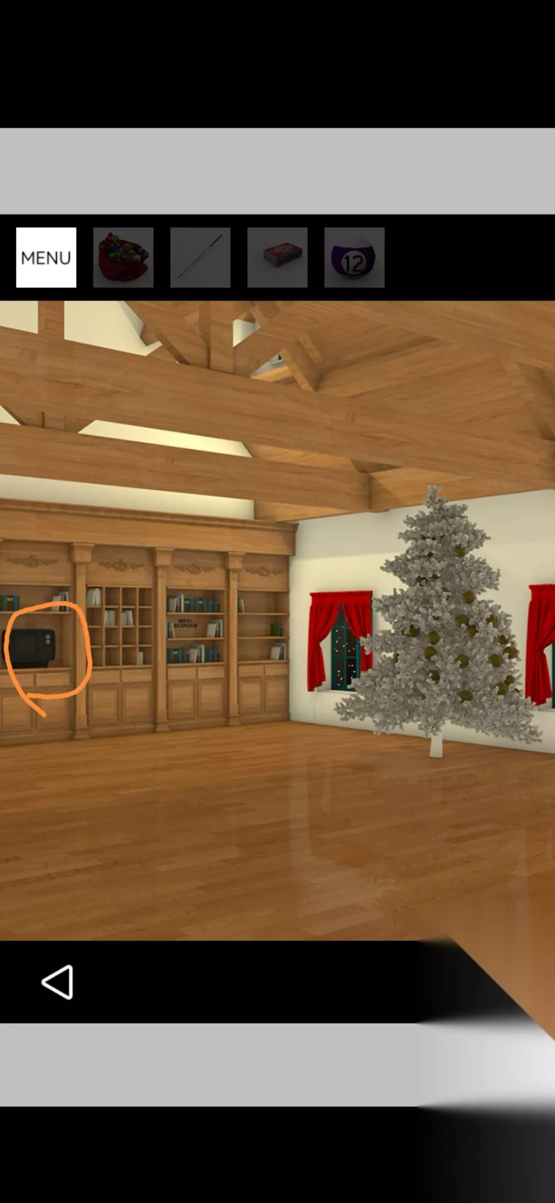 点击拾取图中装饰球盒,把球挂在圣诞树上,点击放大得到提示黄1,放大剩下的空盒得到火柴盒