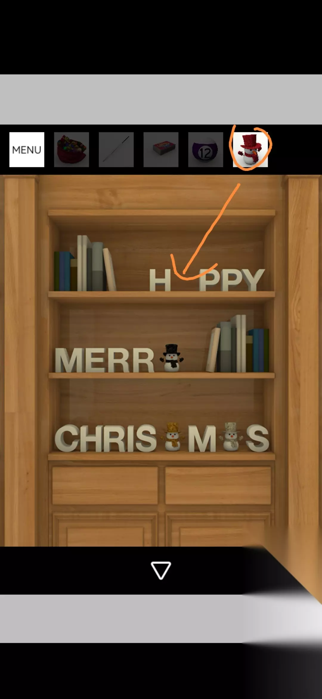 把红色雪人放置于书架的字母空缺处,根据 HAPPY MARRY CHRISTMAS的英文单词调整雪人手臂下上中下,得到螺丝刀