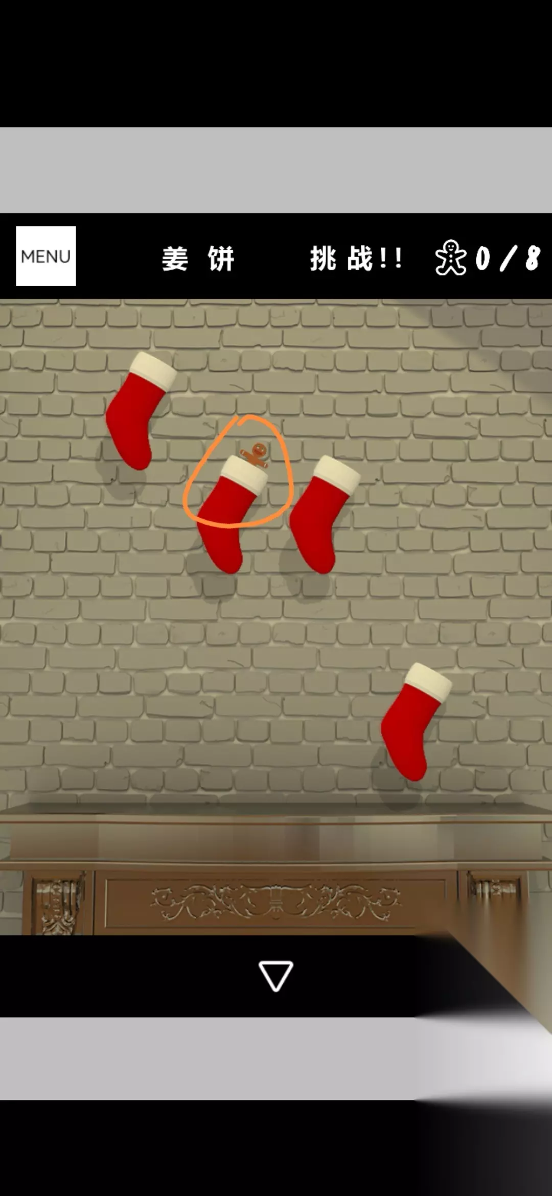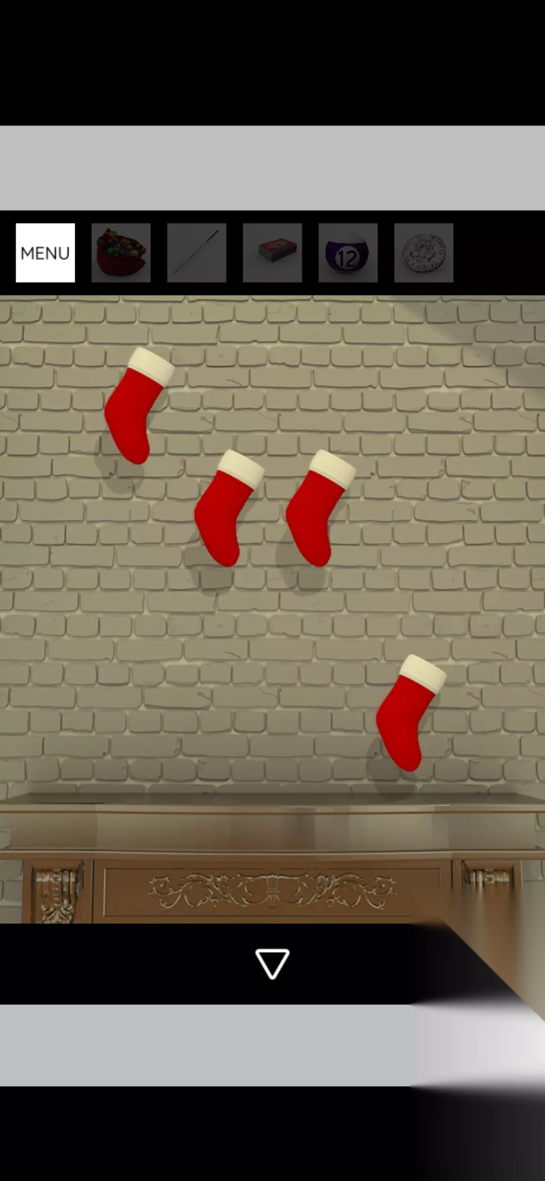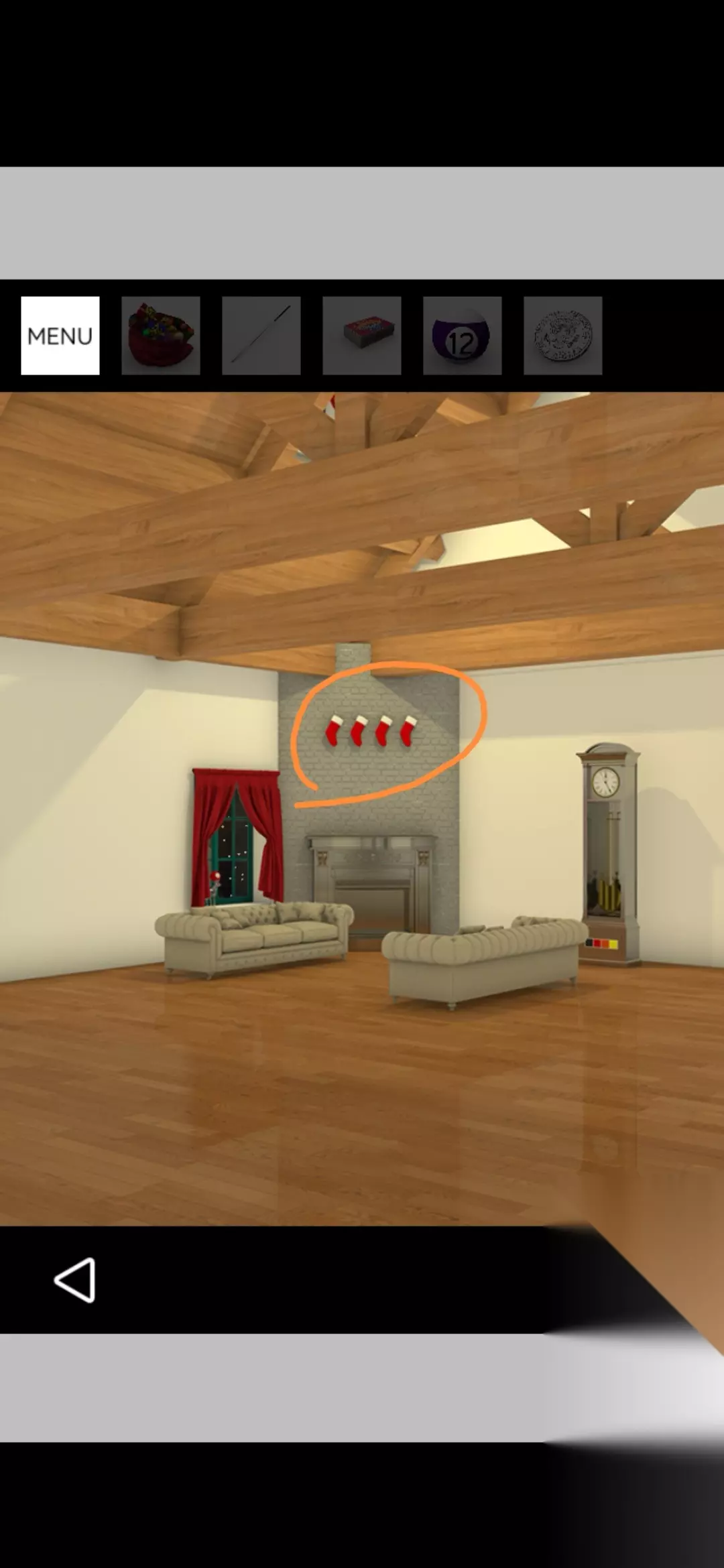 点击电视旁边书架的书得到提示,根据提示将壁炉上方的红色袜子调整为如图,打开壁炉锁