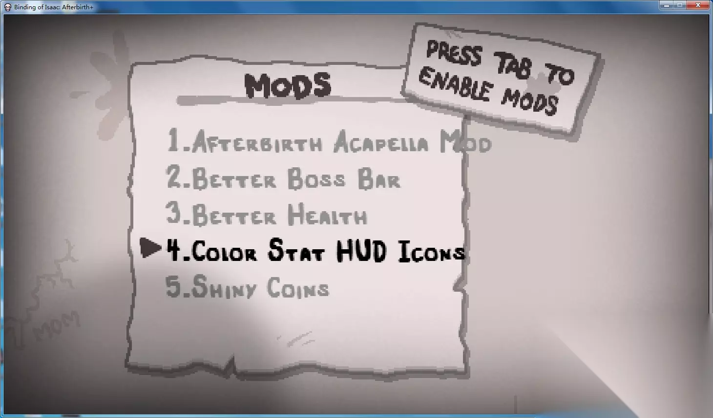 重启后一切正常。 关闭mod也非常简单,进入MODS列表在此选中mod就可以了。 或者直接按TAB键关闭所有mod,如果再次按TAB键,之前开启的mod将会再开启。 然而你会发现开了mod之后会出现无法解锁成就,没存款机之类的。 目前这属于正常现象,毕竟有些mod会降低难度,通过这种方式解锁东西也没意思了。 不过像是这种就改个图标颜色的mod没必要锁成就。 所以这里有一个方法可以避免锁成就,也就是以前的手动安装mod。