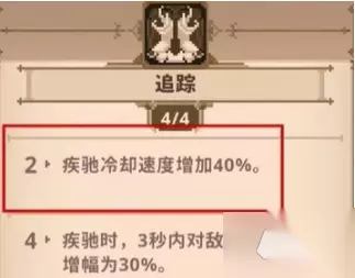 二、套装:【追踪】。 1、两件套可以使疾驰冷却速度增加。 2、四件套可以使对敌人的伤害增加,一个持续三秒时间。