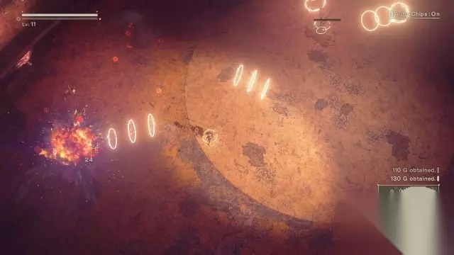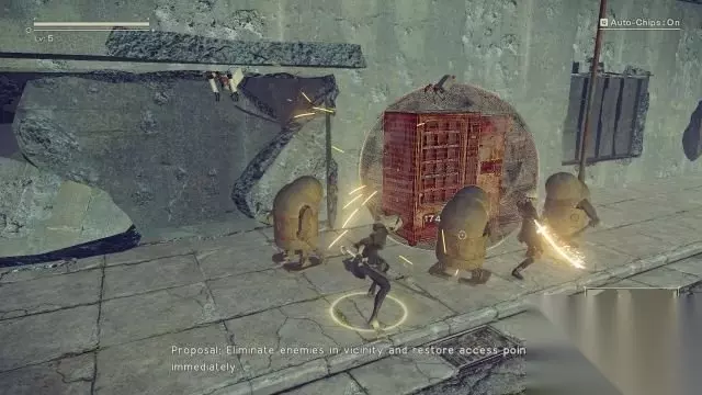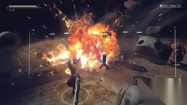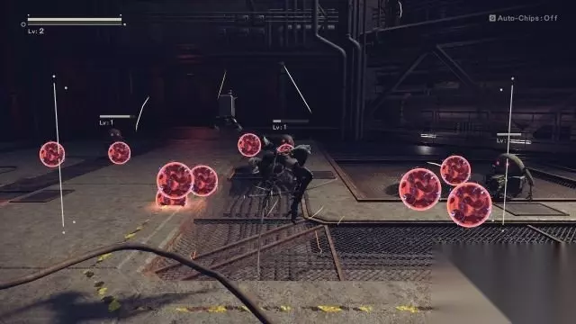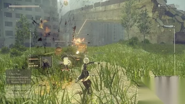 step4.2B的飞行机甲受到重创,她不得不舍弃机甲。 这时候进入到游戏的正题——进行动作游戏。2B要面对机械兵,矮小的机械兵会释放电球,而中等身材的机械兵就会使用近战攻击,以奔跑的方式躲避电球先将矮小机械兵消灭,而当中等机械兵靠近兵出拳时就使用躲避闪开,再对他们进行攻击。