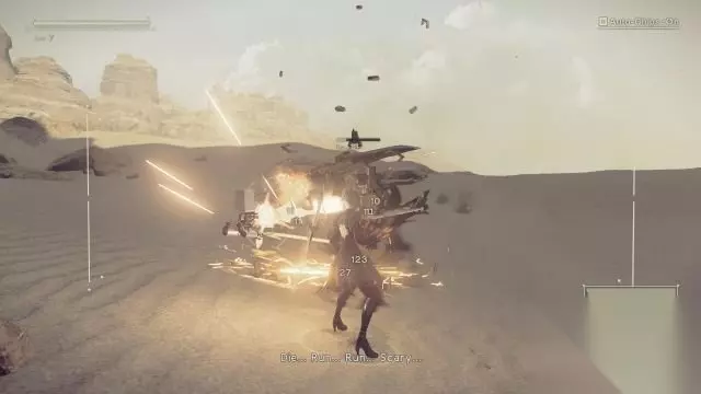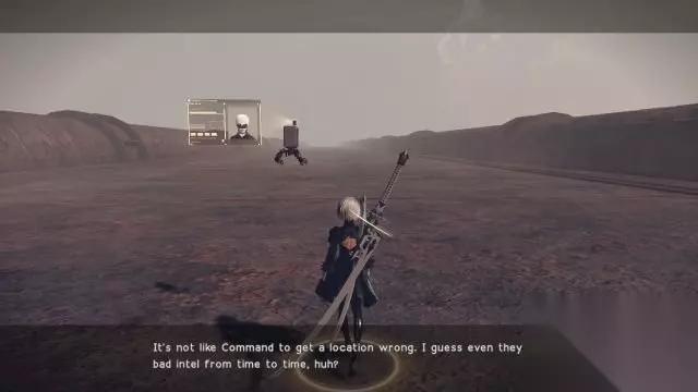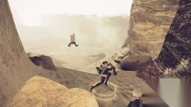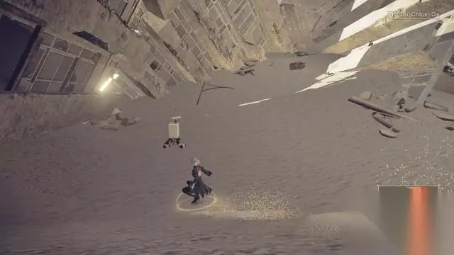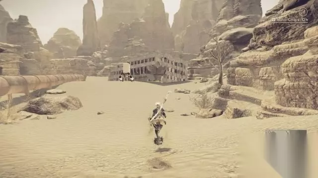 step16.在沙漠之城入口处,两人会遇到一只特别的沙漠机械兵,在战斗期间他可以遁入沙地当中,因此要在其遁地期间经常进行滑步躲避,提防敌人的突袭。 奇特的沙漠机械兵被击退后,他会开始逃跑并且还会说话,这让2B感到相当疑惑,而9S则认为这只是一个声音程序而已。