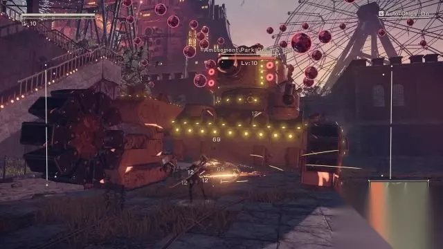 step7.在过山车入口处会遭遇到BOSS巡游花车,初期战斗他会进行地面飞弹散射以及大批量电球攻击,可以去到其左右两侧发动攻势。 当其血量跌至60%时,他的前排两个履带就会变成机械臂可以进行拍打攻击,这时候当巡游花车高举手臂时,2B就要作出回避姿势。