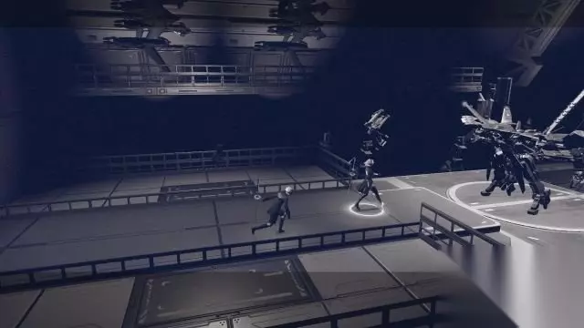 step4.前往机库船上机甲就可以出发。 在出击途中,9S非常疑惑上头为何要派战斗型的2B去执行侦察任务。2B认为她内置的扫描系统足以应付多种情况。