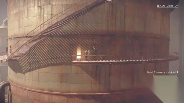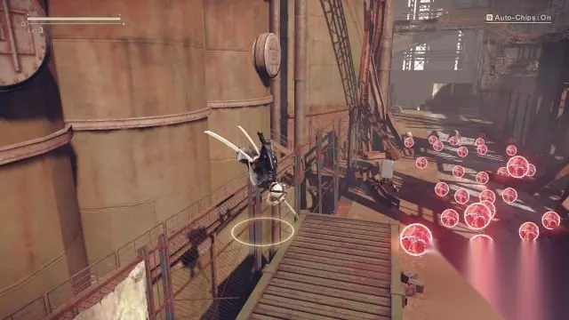 step8.走上楼梯时9S会为2B添加地图数据(即开启小地图)。 跑商圆柱工厂楼梯的中层,先跳到左侧左侧的环形通道上,去到尽头可以找到一个宝箱(1/9)。 接着进入到上方圆柱工厂内,此时要击败大批机械兵。