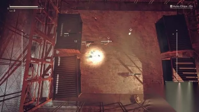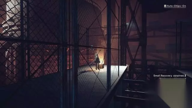 2B线-序幕:荣耀归于人类(工厂2) step10.走上楼梯去到二层,在中部可以发现一个脚手架通往更高层。 此时镜头会变成横版模式,去到脚手架顶层镜头可以找到一个宝箱(3/9)。 接着进入到菱形柱工厂内,这里没有任何敌人只需要从另一侧门离开即可。 落到楼梯底部,在道路拐角位置拿到另一个宝箱(4/9)。