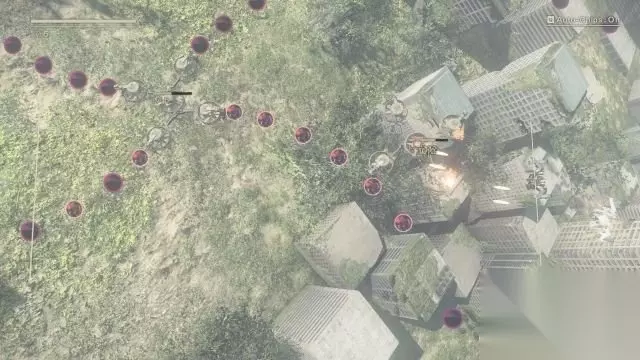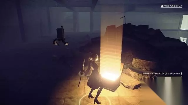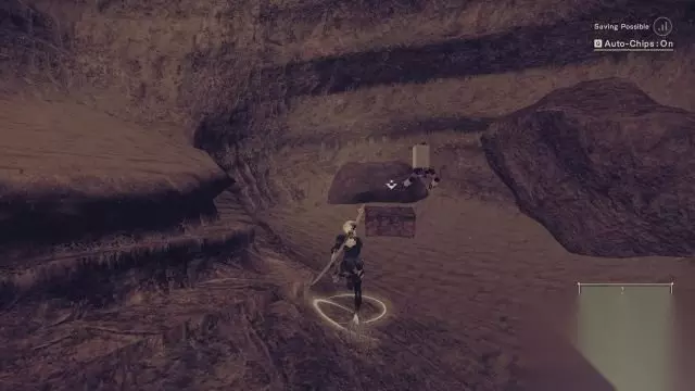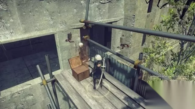 step11.离开反抗军营地后通信员6O询问2B目前的状况,因为没有特殊的东西,2B就没有上报。 首先来进行“供应商的任务”,来到通往工厂大桥断裂处(桥头),在这里可以面对大批中等机械兵。 击败它们以后就可以搜刮它们跌落的零件,small gear、broken circuit和broken key,各一件。 如果击杀在场所有的机械兵都不掉落材料,或者有材料缺的话,建议是去到附近的接入点保存游戏并退出游戏至首页,再重新进入游戏就可以刷新机械兵。 其实这个任务可以在序幕中也可以进行,同样是击破机械兵获取它们体内的零部件。 就在此任务指定的刷怪地点往沙漠方向望去,会发现一个脚手架,跳到其顶部可以找到一个宝箱(4/9)。