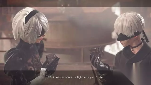 剧情:可是这里的锯齿巨人远远不止一台,在2B和9S身旁足足有3台埋伏着,眼见胜利遥不可及,两人掏出自己的黑匣子发动了自毁以摧毁这三台锯齿巨人。 在临终,2B与9S产生了深厚的感情,YoRHa的口号一直是“为人类而战感到光荣”,此时此刻的2B、9S是“为了同伴而战感到光荣”,打破了他们固定的思维模式。