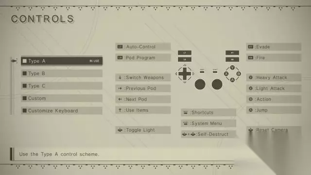 键位操作 XBOXONE版基本键位 LT键:自动控制; LB键:Pod程序; 十字键↑:切换武器; 十字键←:选择前一个Pod; 十字键→:选择下一个Pod; 十字键↓:使用道具; 摁下左摇杆:切换电筒; back键:快捷栏; start键:系统菜单; 摁下左摇杆+右摇杆:自毁; RT键:躲避; RB键:开枪; Y键:重击; X键:轻击; B键:行动; A键:跳跃; 摁下右摇杆:重置镜头;