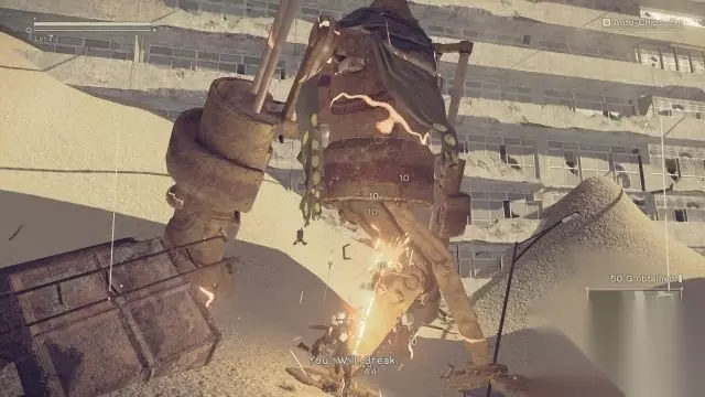 step18.去到大型街区当中,2B和9S会遇到巨臂机械人,他的每一次重拳施展后收招起码要用1分钟的时间,只要持续攻击他,巨臂机械人就处于长时间的硬直当中,在高难度下巨臂机械人有可能会发动3次重拳,只要快速去到其身后就可以完美躲避。 对付巨臂机械人基本没难度。